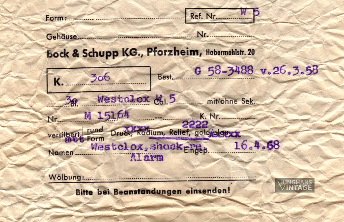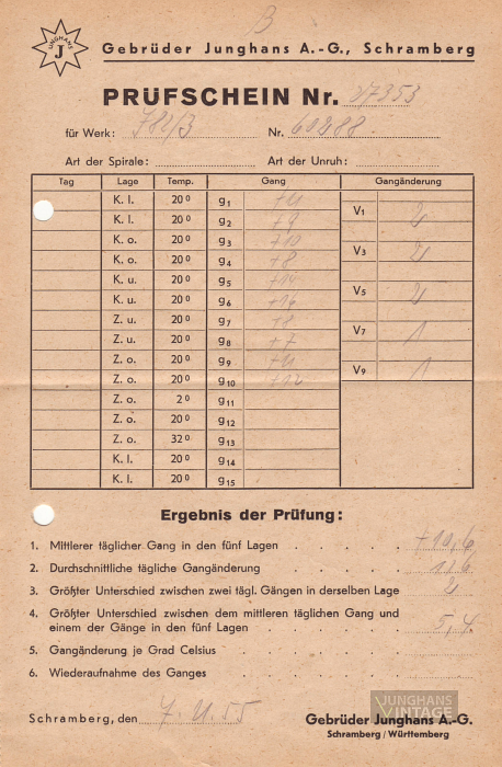 Junghans Prüfschein für Chronometer J82/3 von 1955; Junghans test certificate for Chronometer J82/3 1955