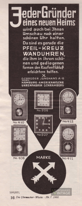 Die Uhrmacher Woche; 28. Jahrgang Nr. 7; 14. Februar 1931; Seite 1; Junghans Pfeilkreuz