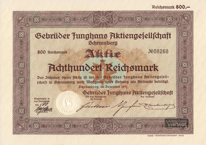Aktie Gebrüder Junghans AG; 800 Reichsmark
