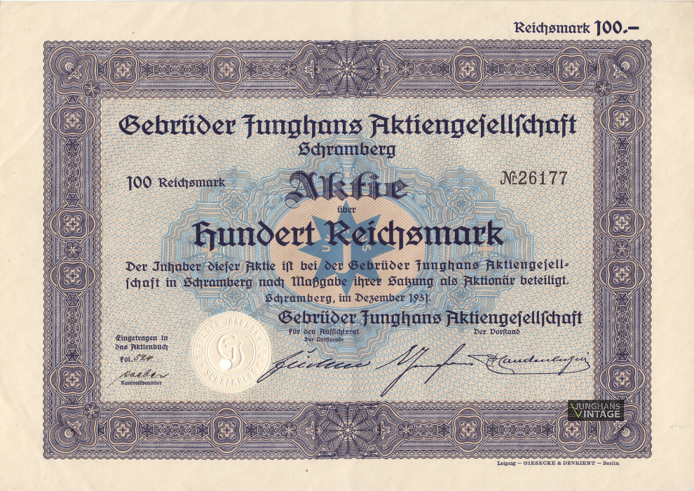 Aktie Gebrüder Junghans AG; 100 Reichsmark