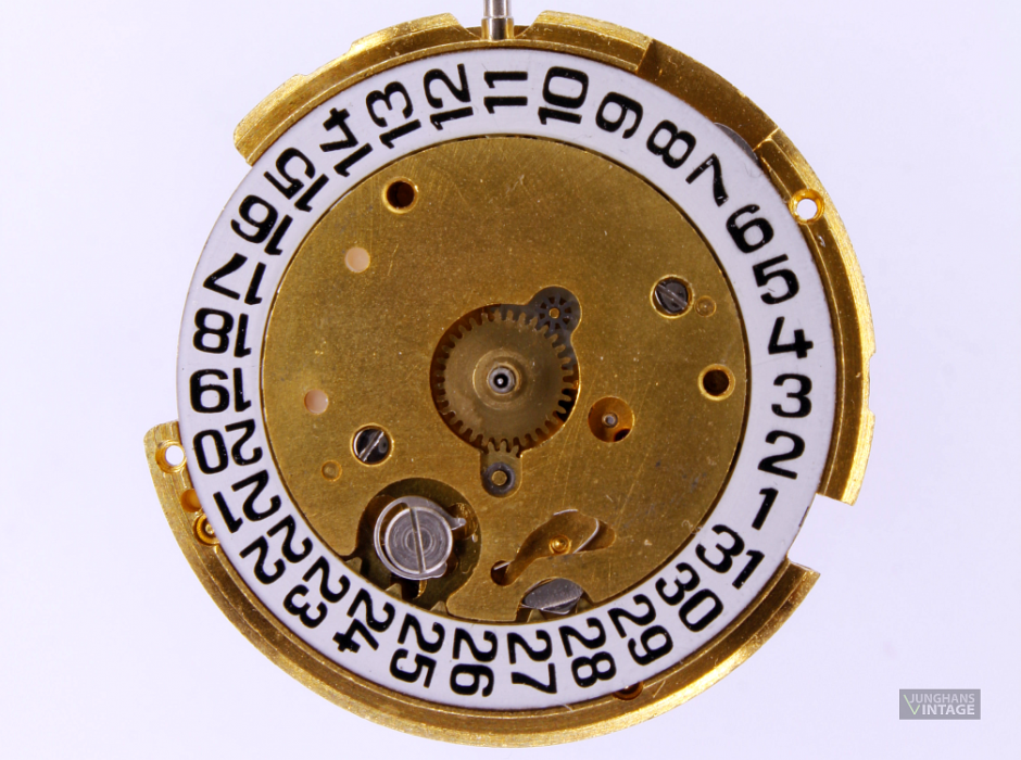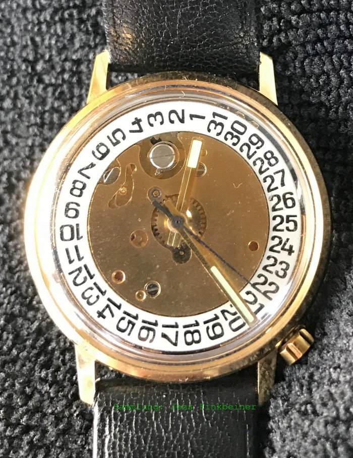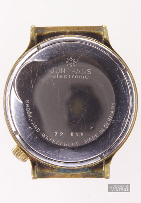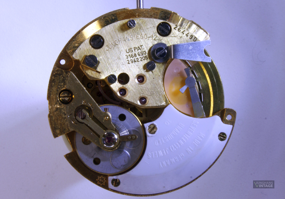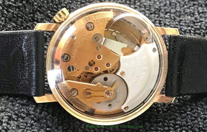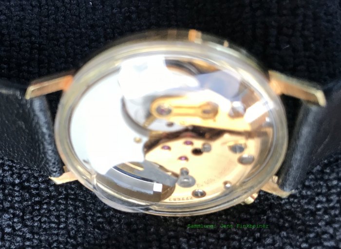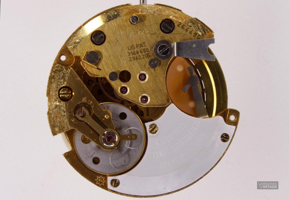 Bei der gezeigten Uhr handelt es sich vermutlich um eine Testuhr, der Boden ist aus Pexiglas, das sogar Platz für die Batterie lässt. Auf ein Zifferblatt wurde verzichtet.