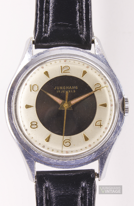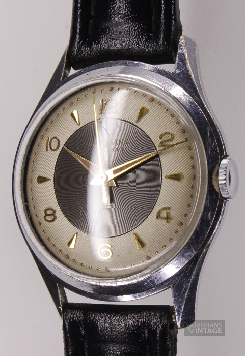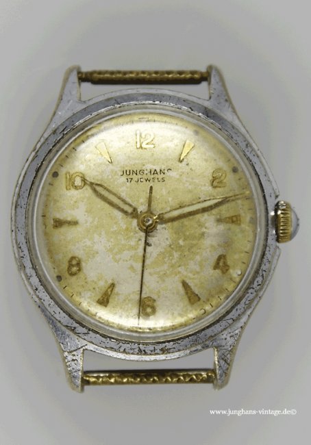 Prägung unter der Unruh: D 5 (April 1955) Der Lack des Zifferblattes dürfte ursprünglich vermutlich beige-golden gewesen sein. Es ist insgesamt deutlich patiniert, fleckig und berieben.