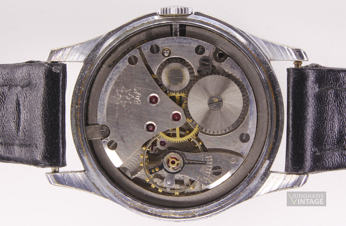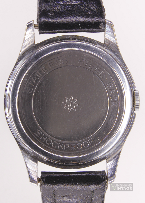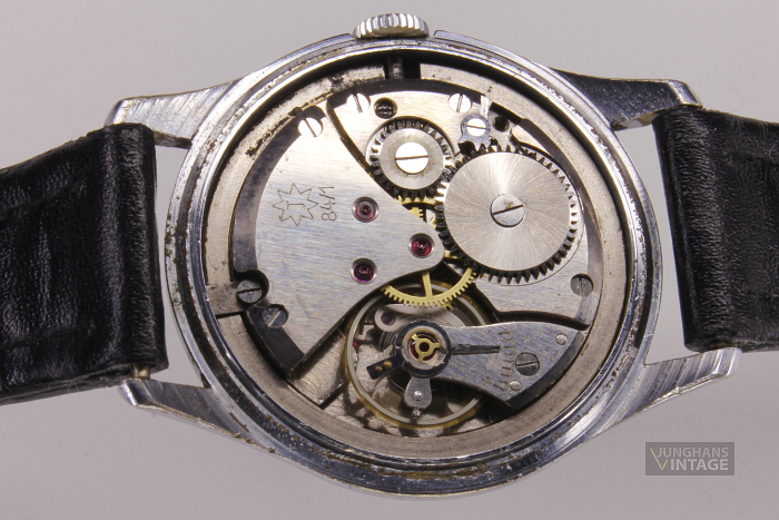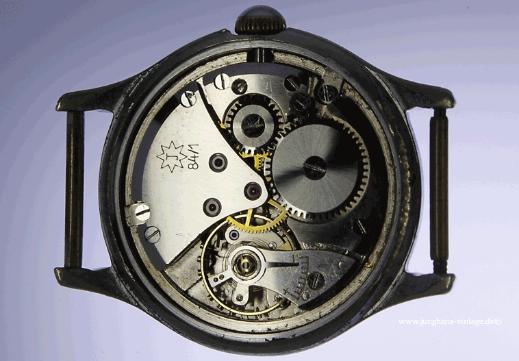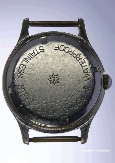 Das Junghans J84/1; Junghans 684.80 wird normalerweise in Trilastic-Ausführung beschrieben. Hier wurde das Kaliber jedoch ohne die Stoßsicherung im Gehäuse verbaut. Der Rückdeckel dürfte durch das dauerhafte Tragen eines Nylon-Durchzugbandes derart gelitten haben.