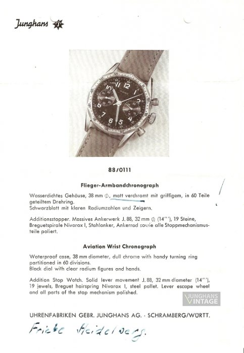Der handschriftliche Vermerk auf dem Informationsblatt weißt auf den Verkäufer des Flieger-Chronographen hin: Die Firma Friebe aus Heidelberg, die seit dem Jahr 1951 Luftfahrt-Bedarf beliefert und damals wie heute auch Uhren für Piloten.