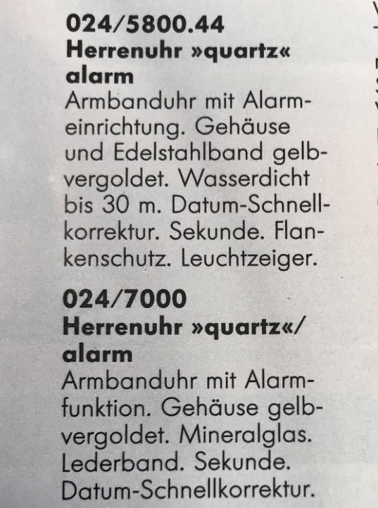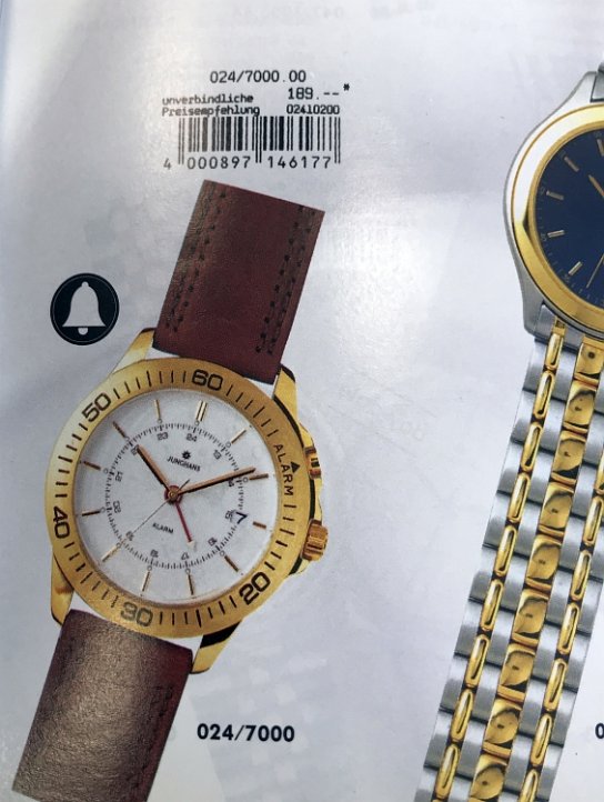 Markenzeichen/Aufdruck ZB: J im achtzackigen Stern (negativ); darunter: JUNGHANS; unter Zeigerzentrum: ALARM; Boden: BASE METAL BEZEL STAINLESS STEEL BACK QUARTZ 24/7000