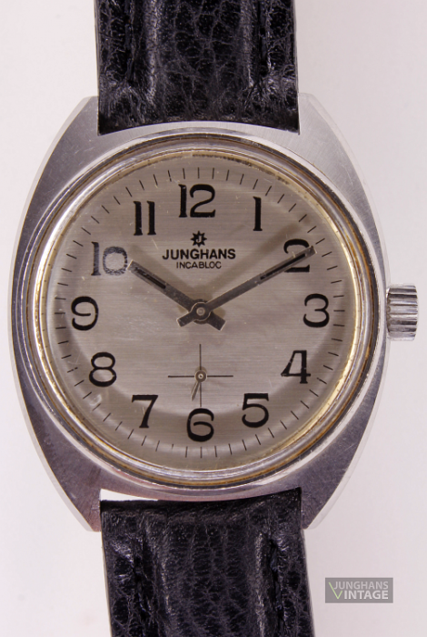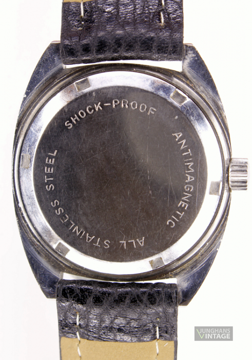• Markenzeichen/Aufdruck ZB: 8-zackiger schwarzer Stern mit hellem J; JUNGHANS; INCABLOC; Boden: ALL STAINLESS STEEL BACK; SHOCK-PROOF; ANTIMAGNETIC