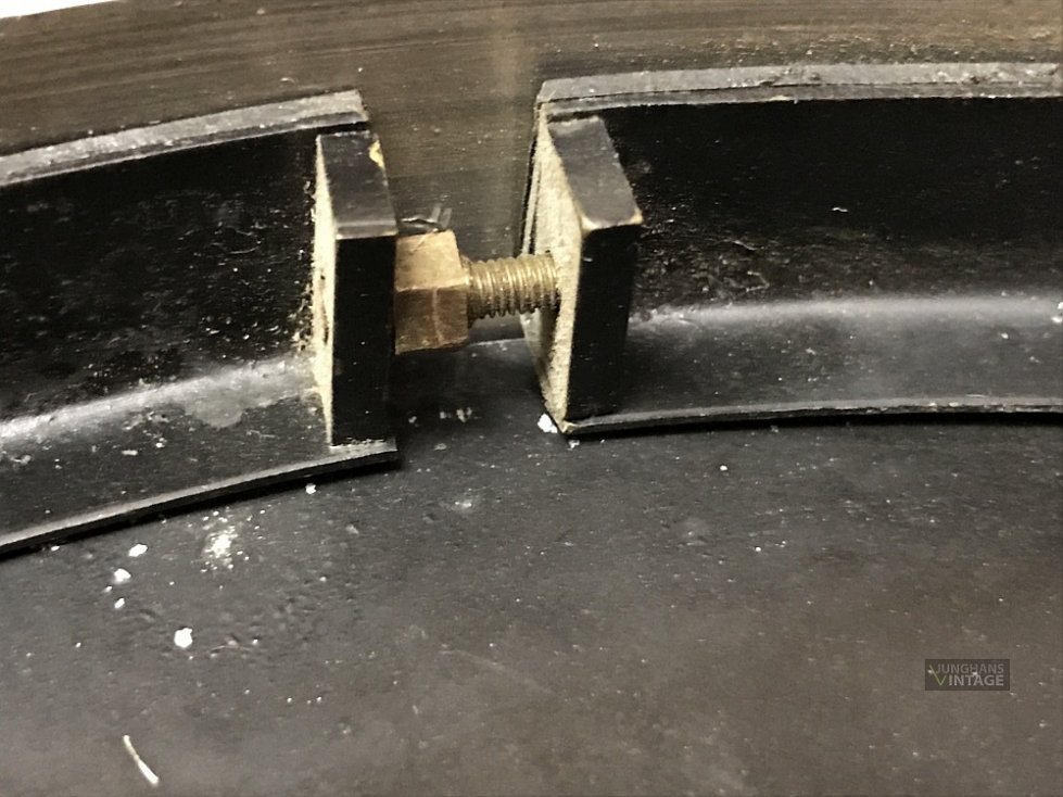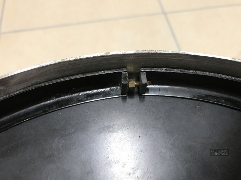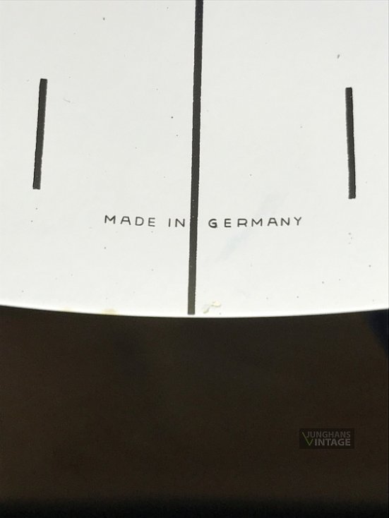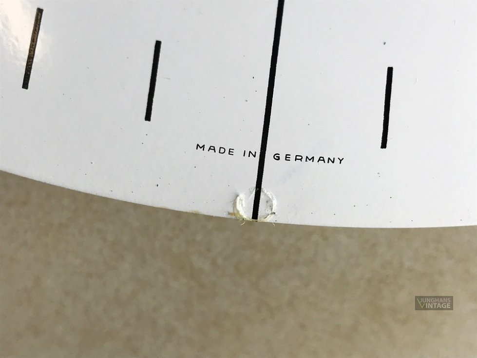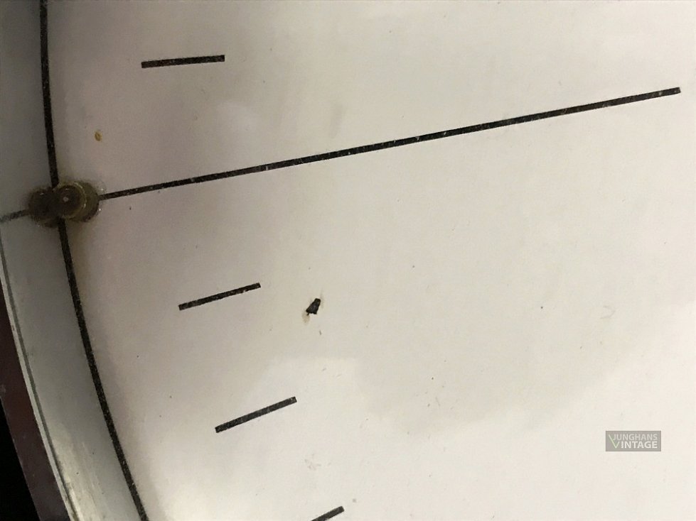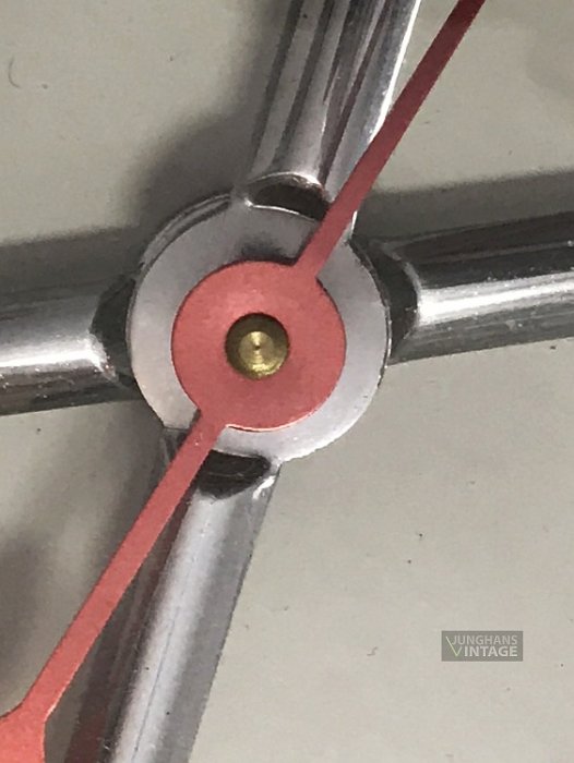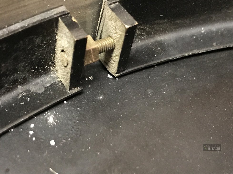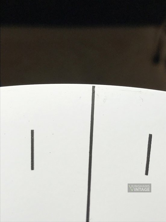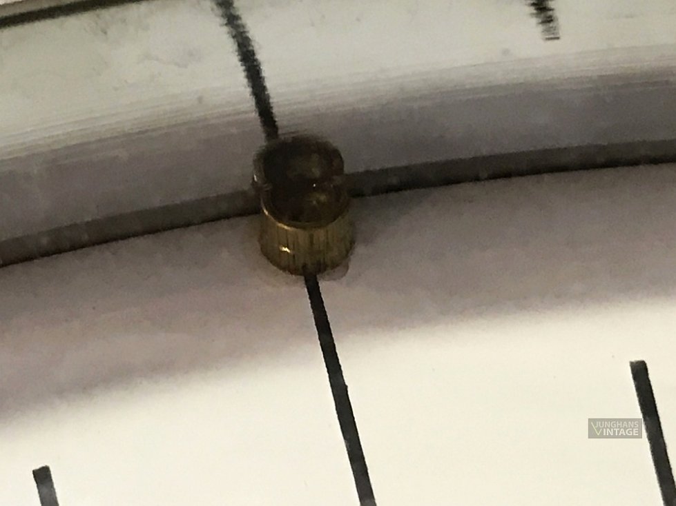 Auf den Stundenstrichen der 12, 3,6 und 9 waren kleine, schraubenähnliche Messingteile aufgebracht. Meine erste Befürchtung, diese seien nachträglich zur besseren Befestigung des Zifferblattes angebracht worden, bewahrheiteten sich glücklicherweise nicht. Die Teile waren nur aufgklebt. Es scheint, dass ein Vorbesitzer der Uhr mit dem Zifferblattdesign Max Bills nicht zufrieden war und die Uhr "verschönern" wollte.