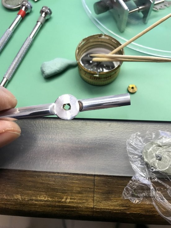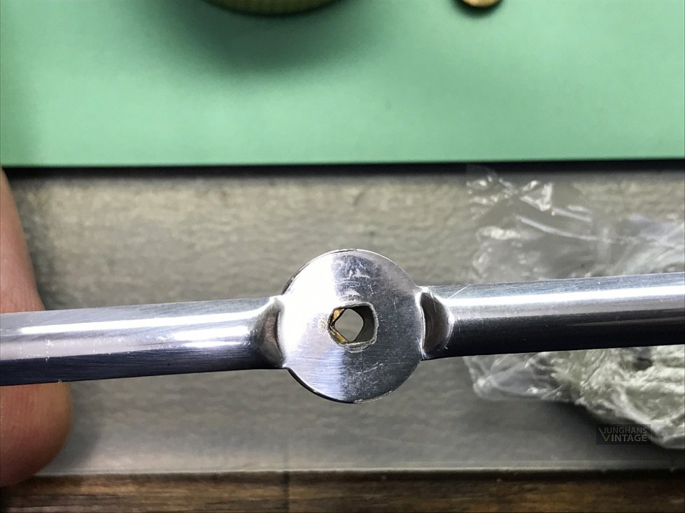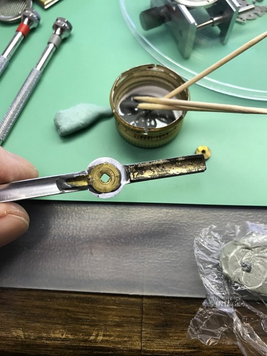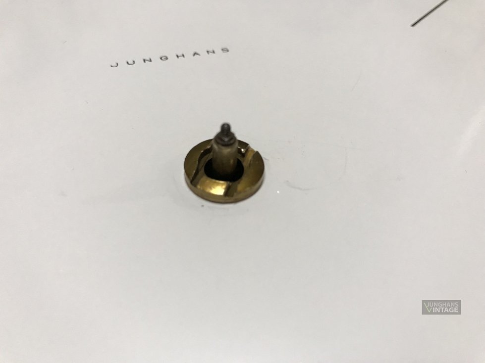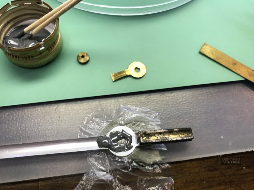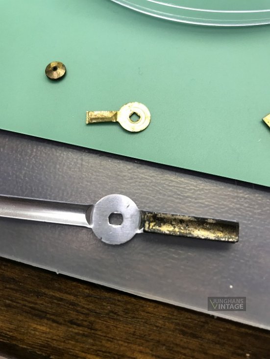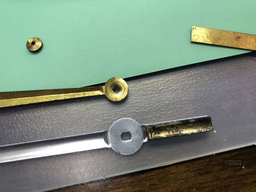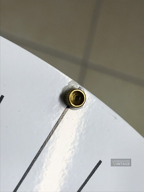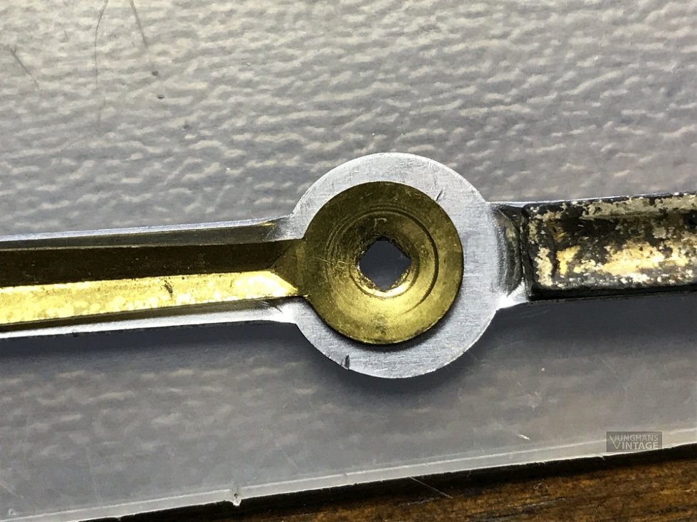 Da ein falsches Werk verbaut war, dessen Achse des Minutenzeigers dicker war als der Durchmesser der Achse des originalen Klappankerwerks, wurde vom Vorbesitzer das Zeigerloch des Sekundenzeigers vergrößert. Da dieser dann beim originalen Werk nicht halten würde, musste das Zeigerloch verkleinert werden. Leider ist mir nicht bekannt, wie Profi-Uhrmacher dies verkleinern.