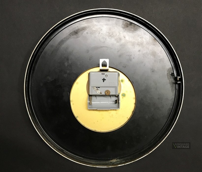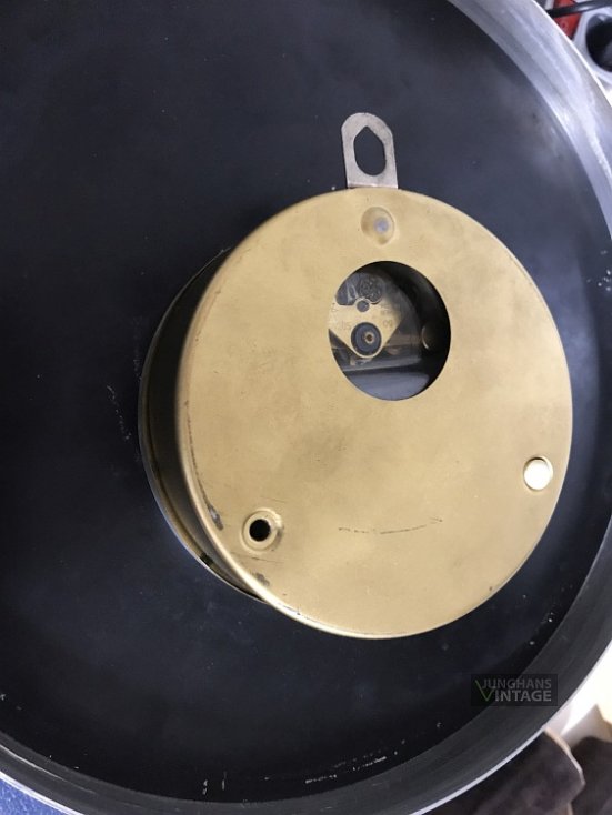 Bei der anderen Messing-Variante ist das Werk in einem tiefen Gehäuse und sie ist mit einem Glas versehen. Diese Version hat einen Durchmesser von 24 cm und kostete damals 123,- DM. Die Referenznummer lautet: 322/0411