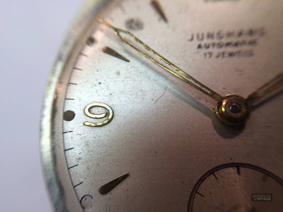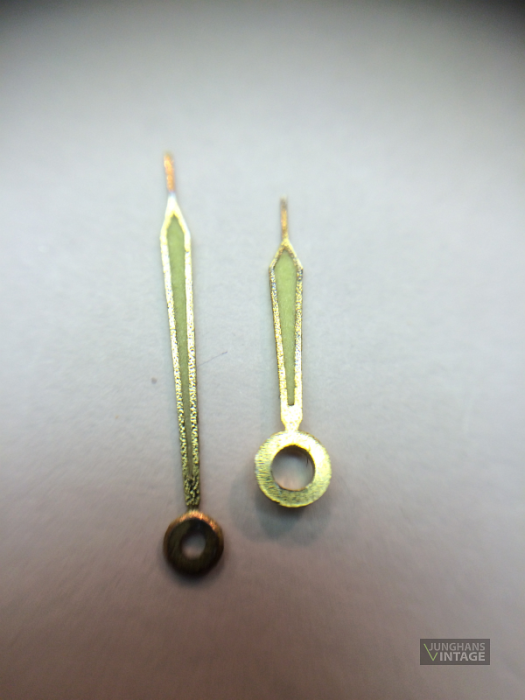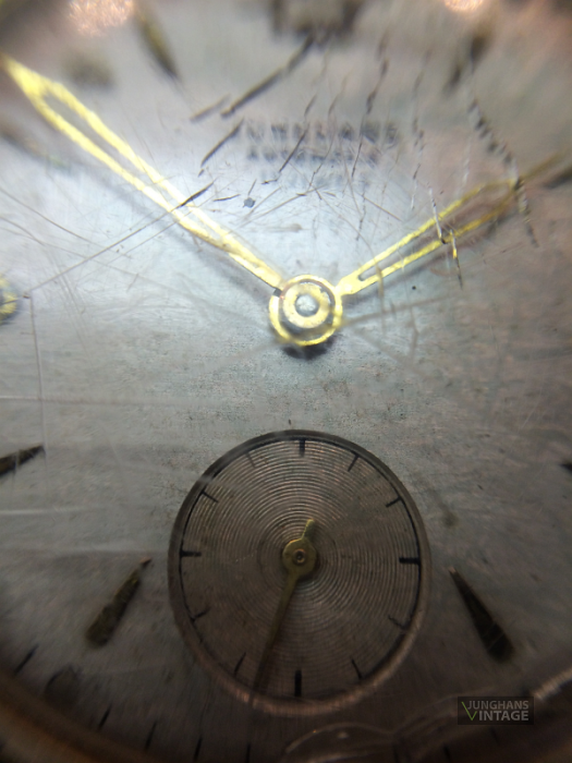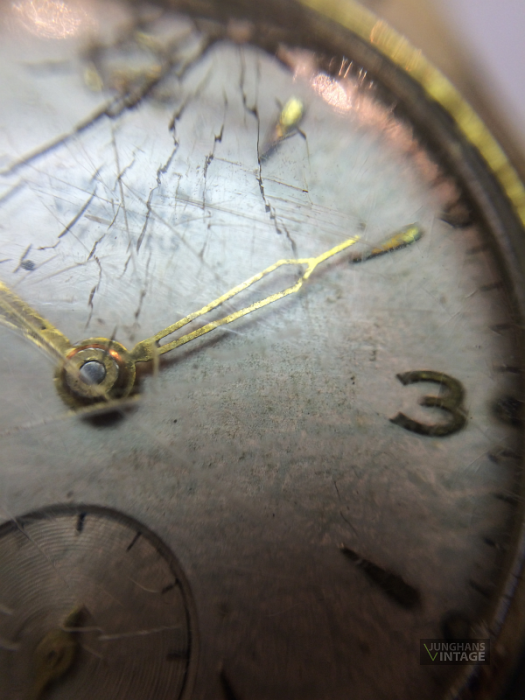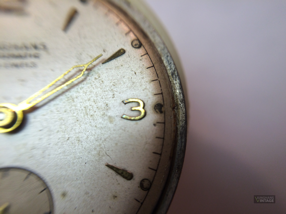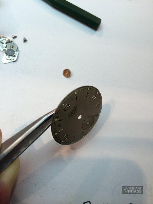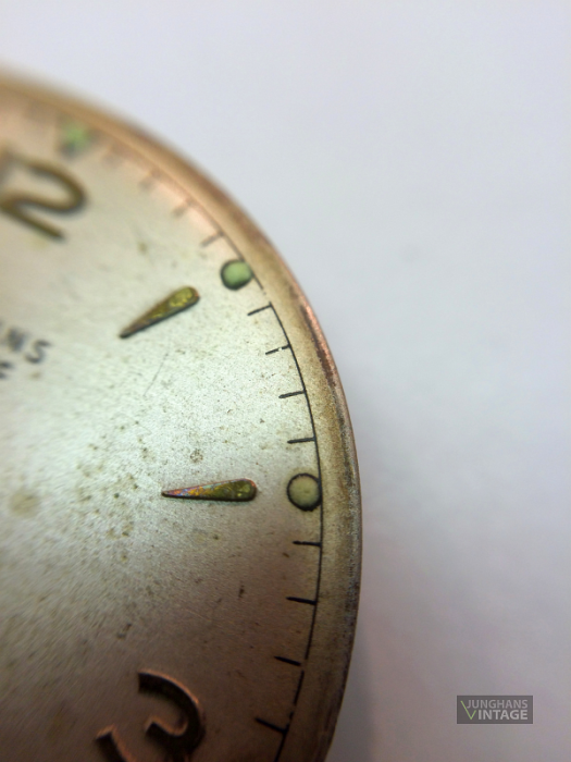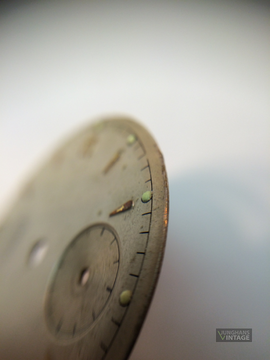 Das Zifferblatt war deutlich verschmutzt und wurde oberflächlich vorsichtig gereinigt. Die fehlenden Leuchtpunkte wurden erneuert. Die alte Leuchtmasse der Zeiger wurde entfernt und neue aufgebracht.