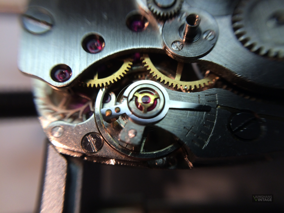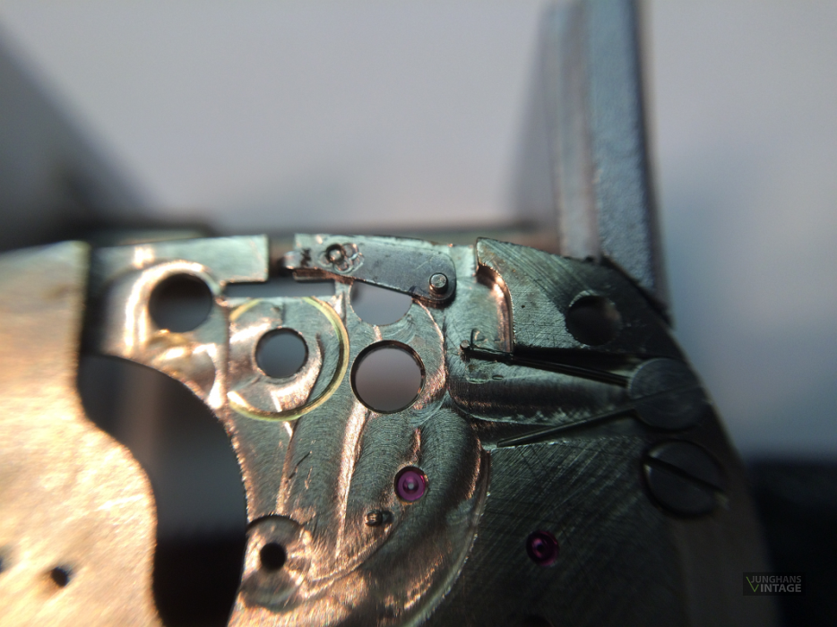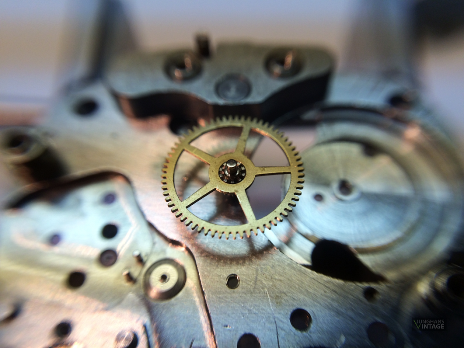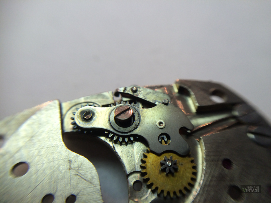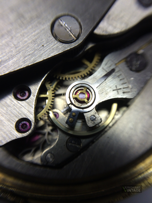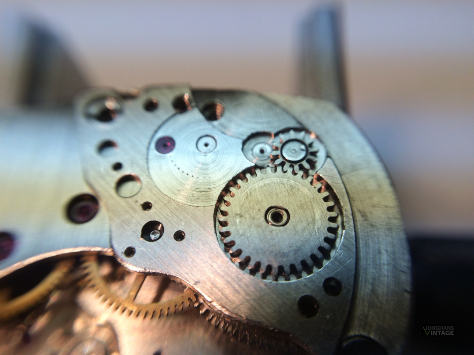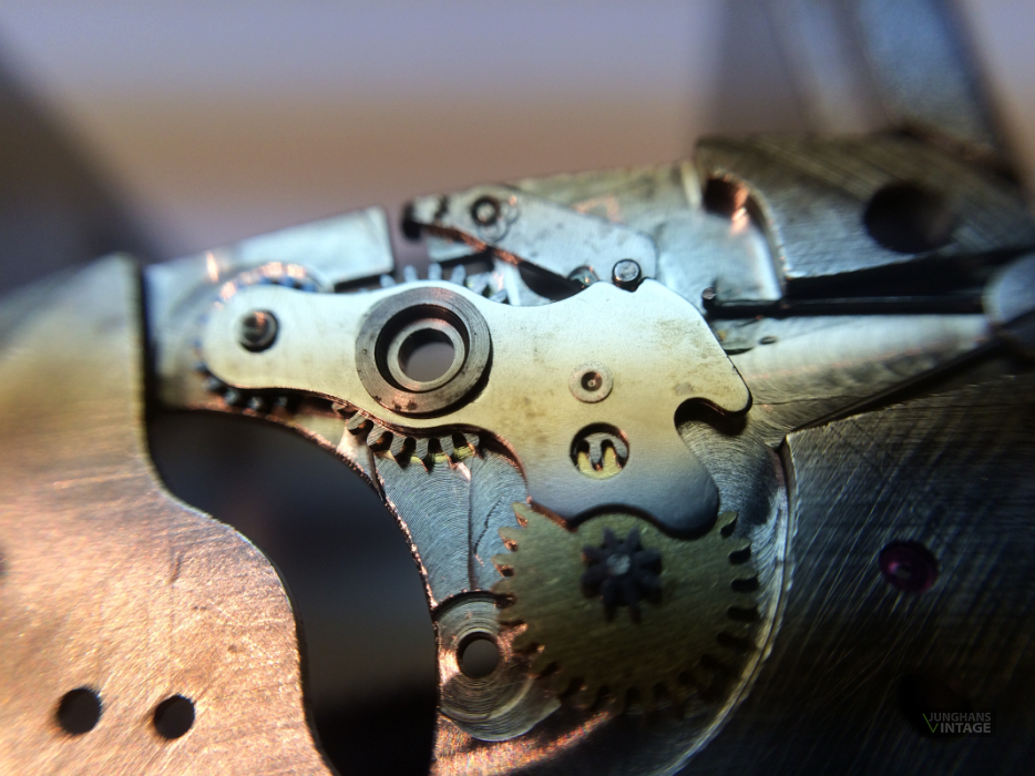Jetzt folgte der Rest. Das Junghans J98 ist ein Kaliber in Pfeilerbauweise und besitzt einen einfachen aber gut funktionierenden Wippenaufzug. Die Unruh ist eine zweischenkelige Ringunruh ohne Ausgleichsschrauben. Auf dem Foto kann man gut erkennen, das der Unruhreif zum Auswuchten winzige Bohrungen hat.