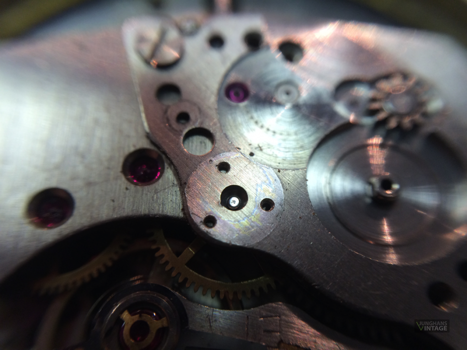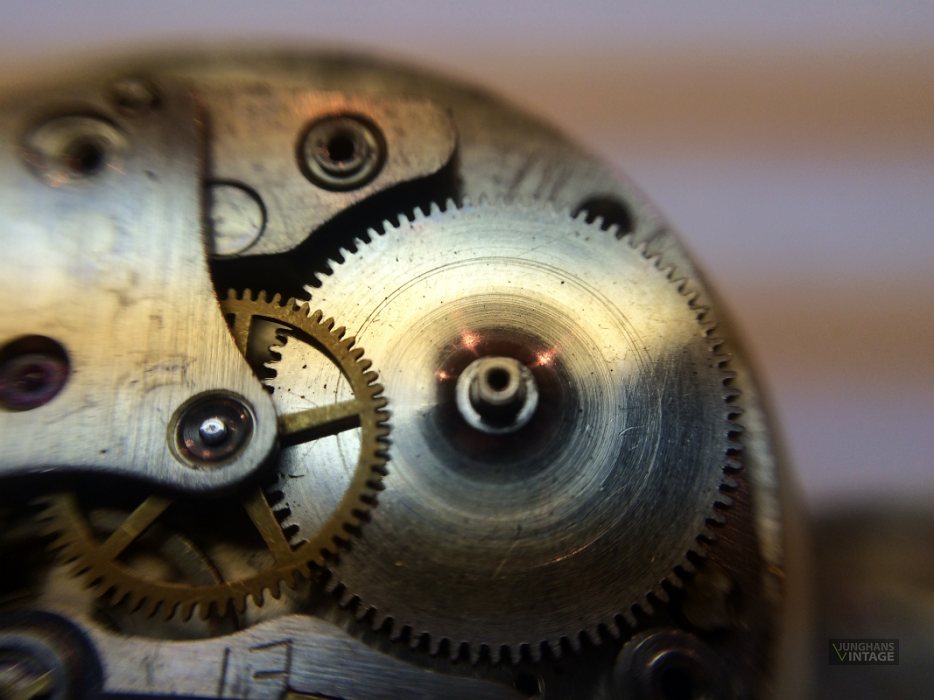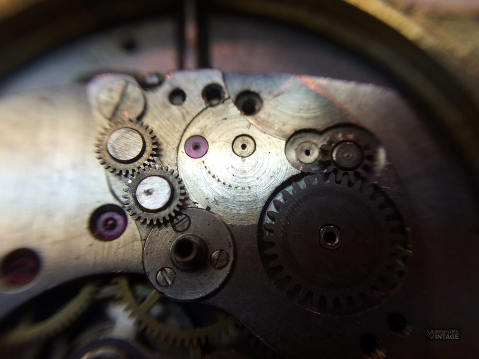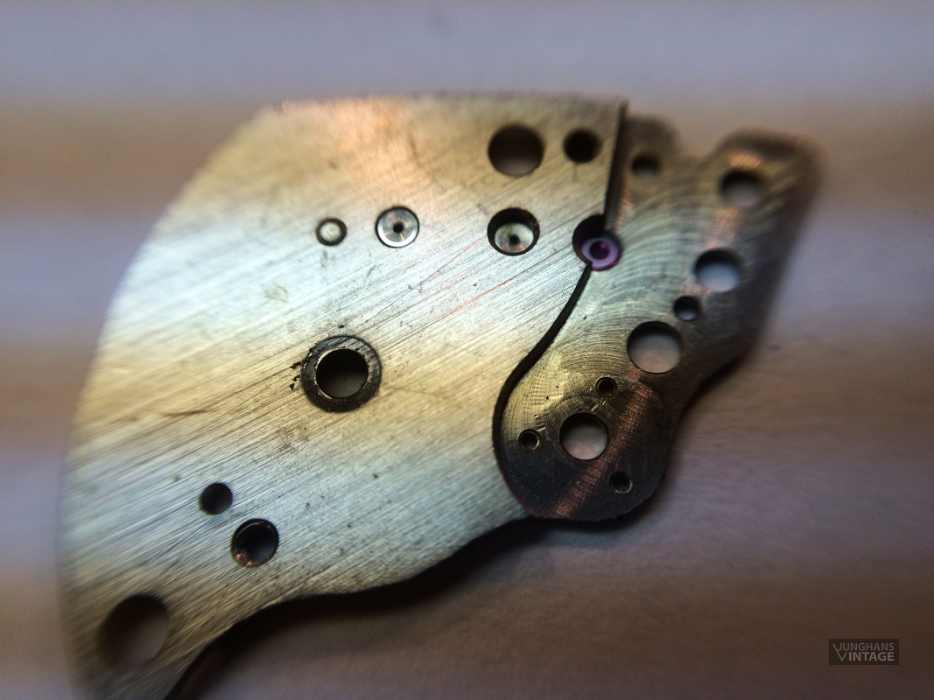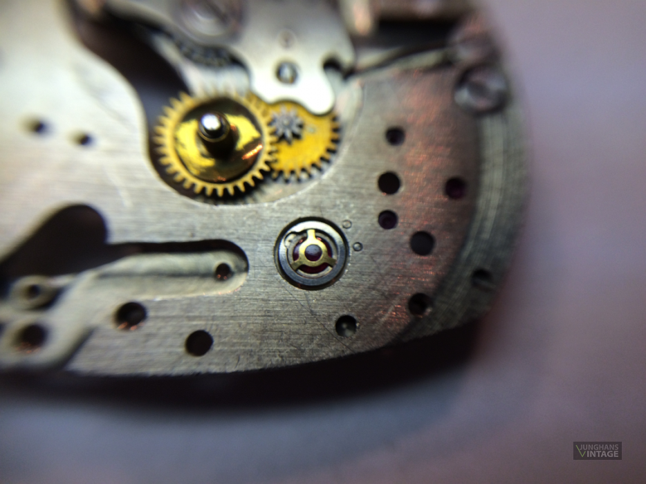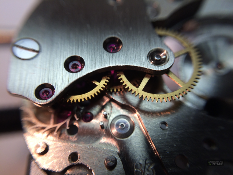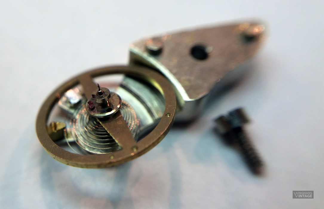 Jetzt folgte der Rest. Das Junghans J98 ist ein Kaliber in Pfeilerbauweise und besitzt einen einfachen aber gut funktionierenden Wippenaufzug. Die Unruh ist eine zweischenkelige Ringunruh ohne Ausgleichsschrauben. Auf dem Foto kann man gut erkennen, das der Unruhreif zum Auswuchten winzige Bohrungen hat.