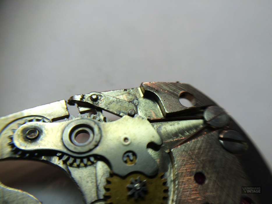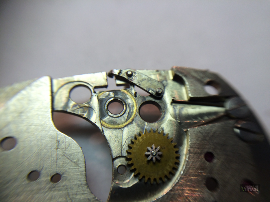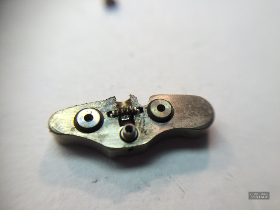 Bei der kurzen Inspektion übersah ich an dieser Stelle, dass ein Zapfen eines der Triebe abgebrochen war und höchstwahrscheinlich die Ursache für das Nichtfunktionieren des automatischen Aufzuges sein dürfte.