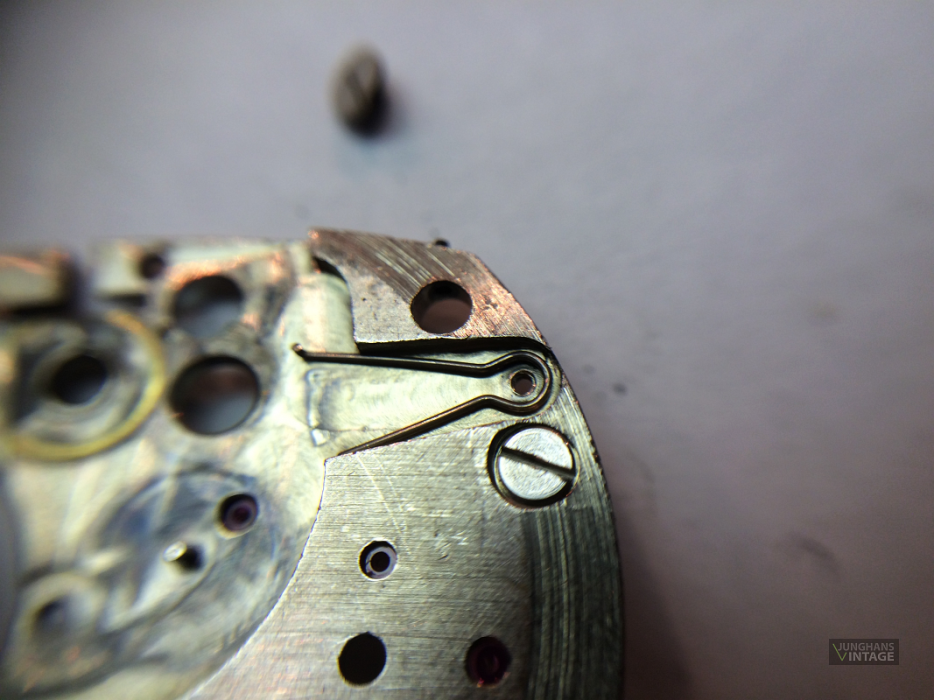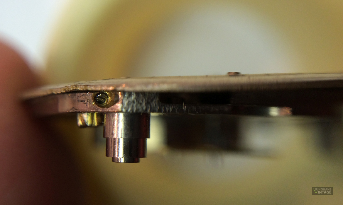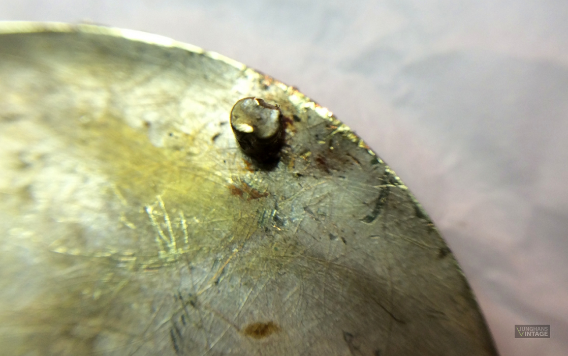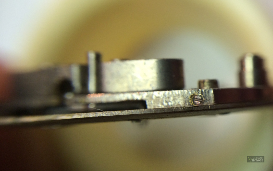 Noch immer konnte ich das Zifferblatt nicht lösen. Nachdem alles an empfindlichen Teilen demontiert war, sah ich, dass eine der seitlichen Werkhalteschrauben nur noch einen halben Schraubenkopf hatte. Die winzigen Madenschrauben drücken seitlich auf die in der Grundplatine steckenden Füße des Zifferblattes und es war deutlich zu sehen, dass sich hier schon jemand zu schaffen gemacht hatte. Der Rest des Schraubenkopfes war arg geschunden und auch ich schaffte es nicht, die Schraube zu lösen.