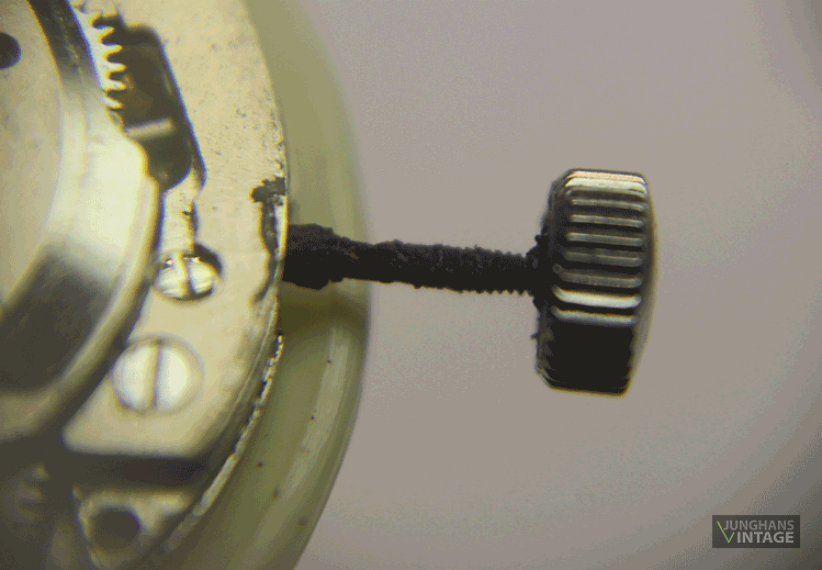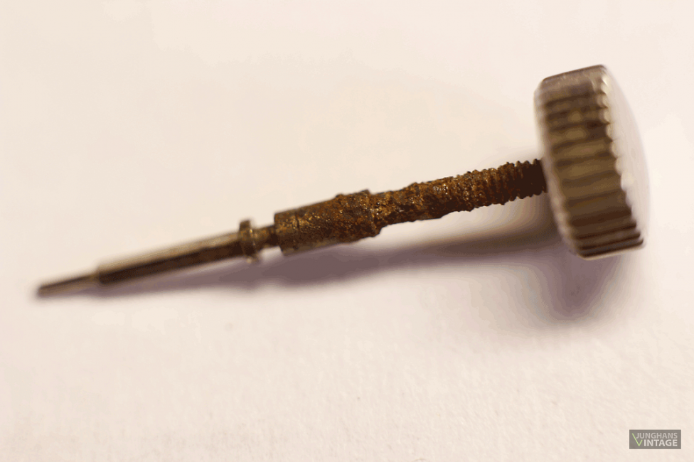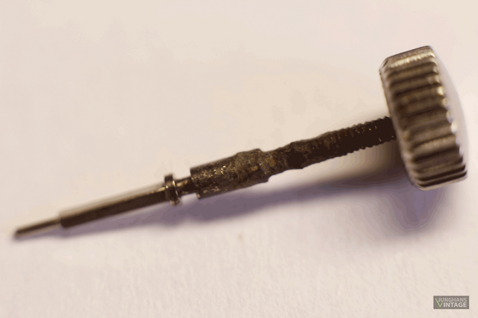Nach dem Ausschalen aus dem Gehäuse wurde eine stark verrostete Aufzugswelle sichtbar. In der Hoffnung, dass diese noch ein wenig länger halten wird, entschloss ich mich, die Welle nach der Reinigung wieder zu verbauen.
