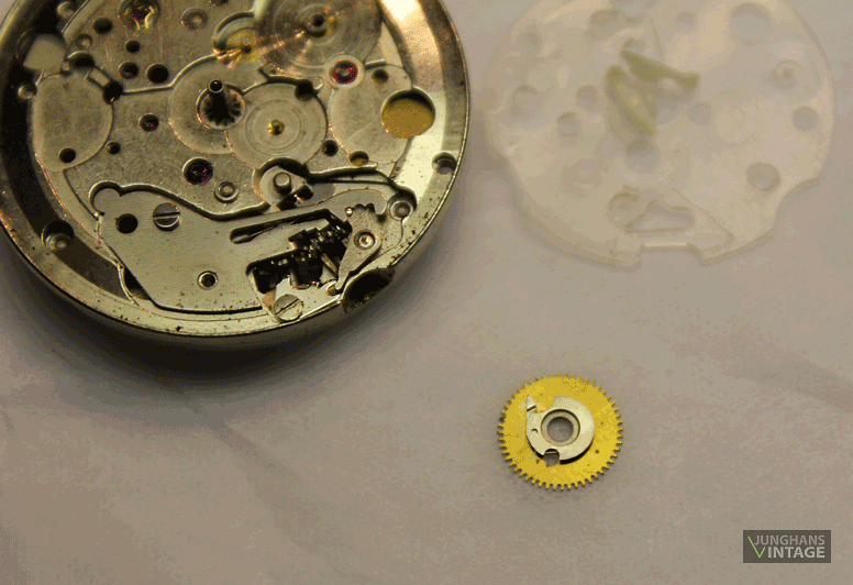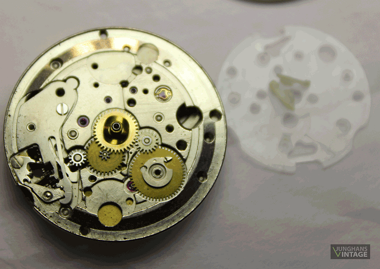 Ohne die Automaticgruppe und den Rotor ist das Werk ziemlich flach und entspricht im Aufbau dem Junghans 623.