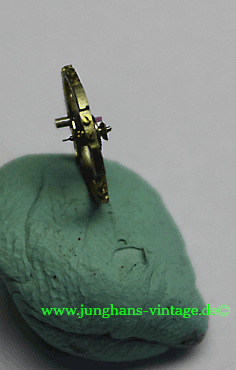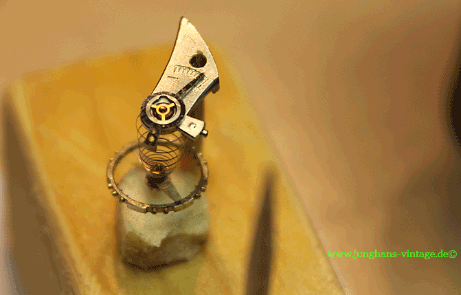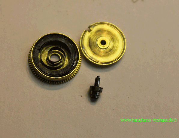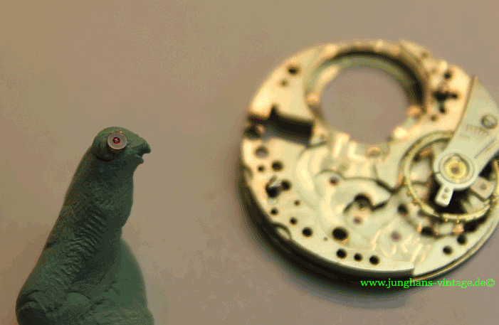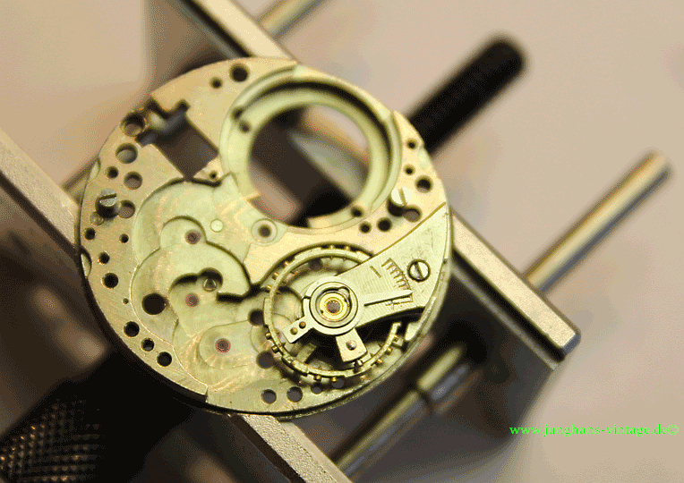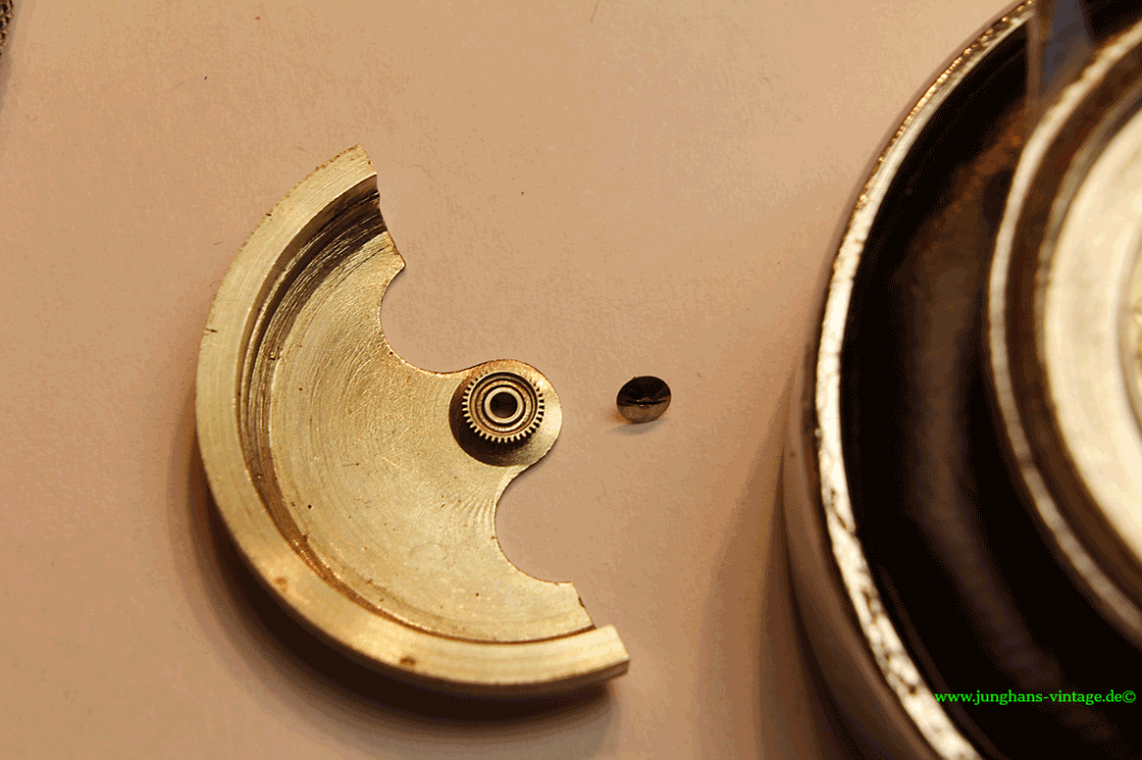 Außerdem war der eine Zapfen der Unruhwelle gebrochen. Da das Junghans J80/12 einen besonderen Unruhreif besitzt, bei dem die Ausgleichsschrauben vertieft sind, konnte ich keine Unruh eines Spenderwerkes einer „normalen“ J80 nutzen. Das Austauschen einer Unruhwelle übersteigt leider mein Können bei weitem, also auf mit der Uhr zum Uhrmacher, der die Unruhwelle wechselte und noch eine Feder für die Stoßsicherung einsetzte. Da ich die Uhr selbst reinigen wollte, habe ich den Uhrmacher gebeten, ausschließlich die Unruhwelle zu wechseln. Dadurch war ein Test auf anschließenden Gang beim Uhrmacher nicht möglich.