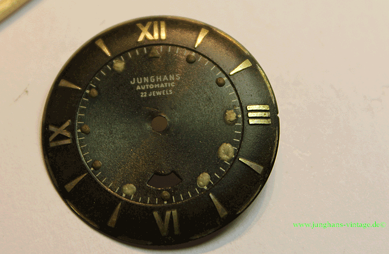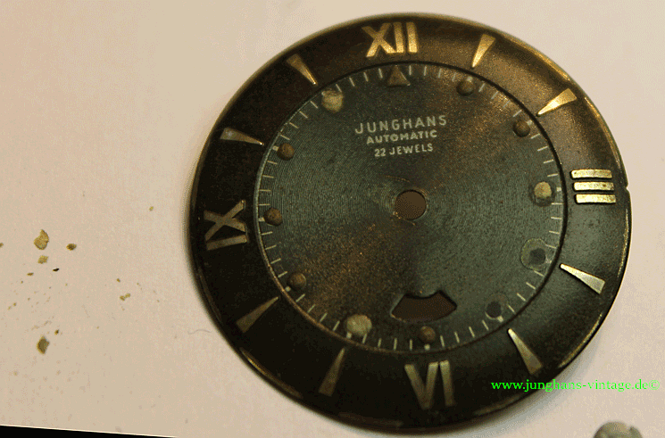 Das Zifferblatt machte mir am meisten Sorgen. Die nachträglich aufgebrachte Leuchtmasse (bei 3, 4 , 5, 7, 11) der Dots war vom Vorgänger teilweise sehr verlaufen appliziert worden und ich beschloss zunächst, nur die schadhaften und zu großen Dots zu ersetzen. Die Leuchtpunkte bei 1, 2, 6, 8, 9, 10 schienen mir original jedoch auch teilweise nicht exakt rund. Auch das Dreieck unter der 12 ist wohl original. Doch zur Leuchtmasse komme ich nochmal später.