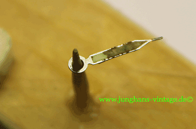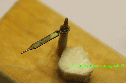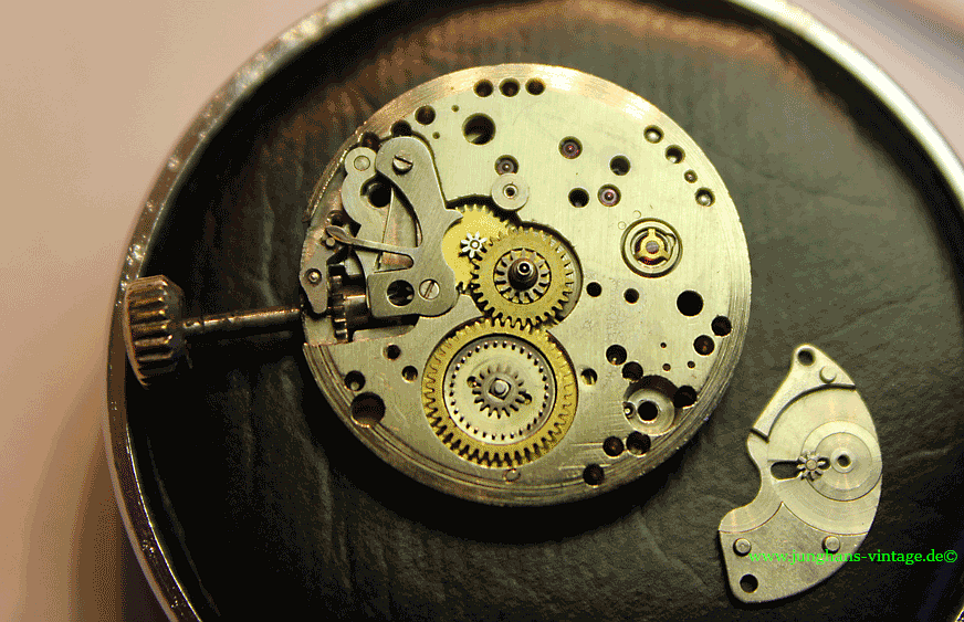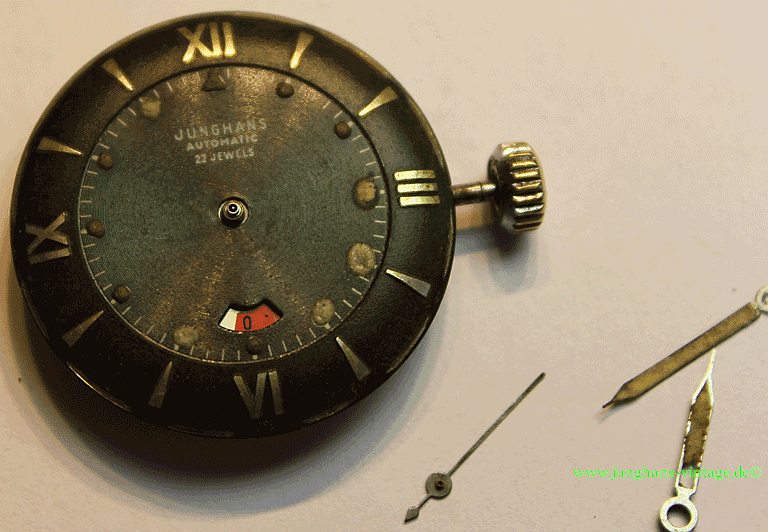 Um das Werk zu zerlegen, mussten natürlich die wohl nicht originalen Zeiger abgenommen werden. Sie sind zu lang, scheinen aber aus der Zeit, aus der die Uhr stammt. Vielleicht hatte der damalige Käufer den Wunsch nach längeren Zeigern. Wer die richtige Länge sehen will, kann hier die Schwesteruhr mit den richtigen Zeigern sehen: Junghans J80/12; Junghans 680.75