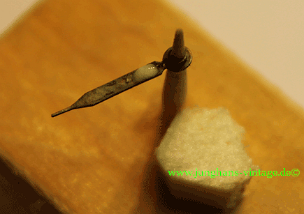 Auch bei den Zeigern habe ich anfangs versucht, nur das ausgebröckelte Stück zu ersetzen. Im ersten Foto ist die frisch aufgetragene Paste zu sehen, im zweiten nach Trocknung der letzten Schicht. Das dritte Foto zeigt die Vorderseite des Zeigers.