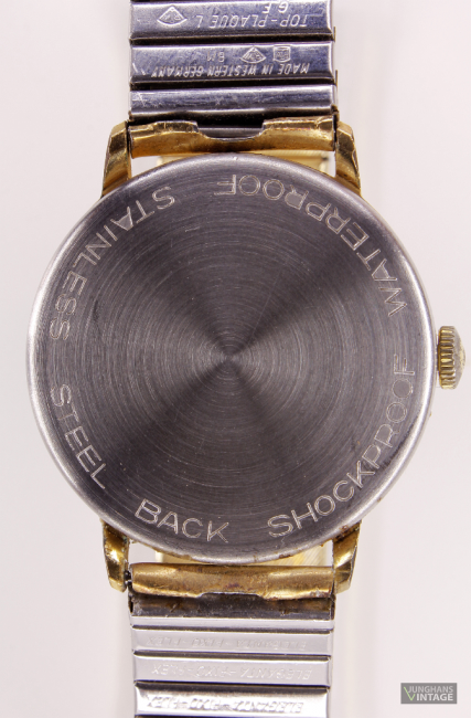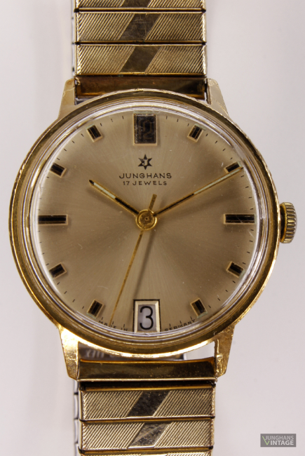 Trademark / printing on dial: 6-pointed star with J; below: JUNGHANS; below: 17 JEWELS; at 6: Date; left of date: MADE IN; right: GERMANY; back: STAINLESS STEEL BACK SHOCKPROOF WATERPROOF