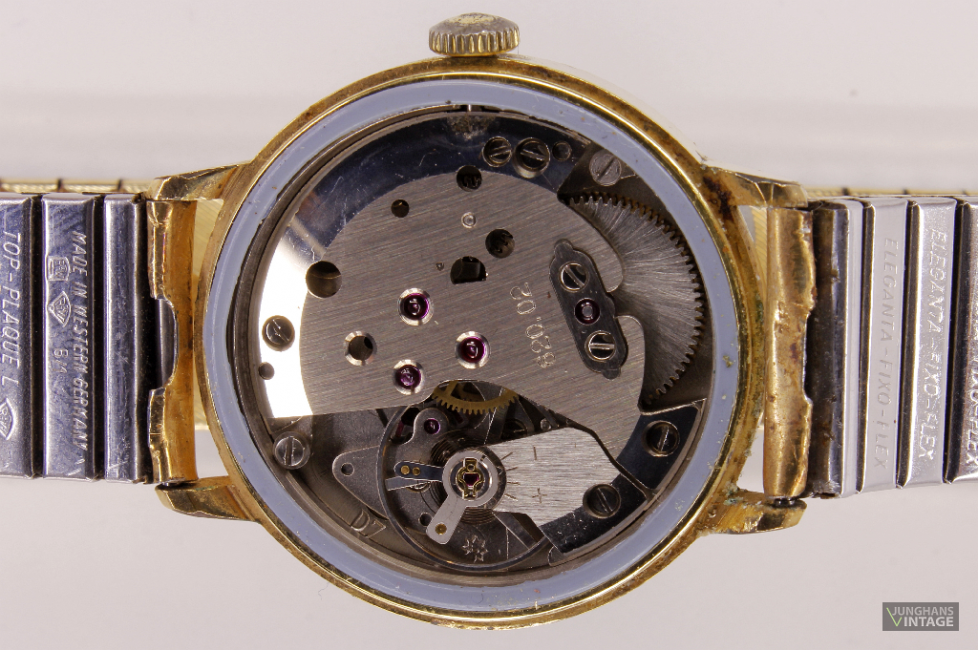 Although the shown movement is marked with the caliber-stamp 620.02 (arched date ring at 3 o'clock) it is a matter of the caliber Junghans 620.58 (date display at 6 o'clock ).