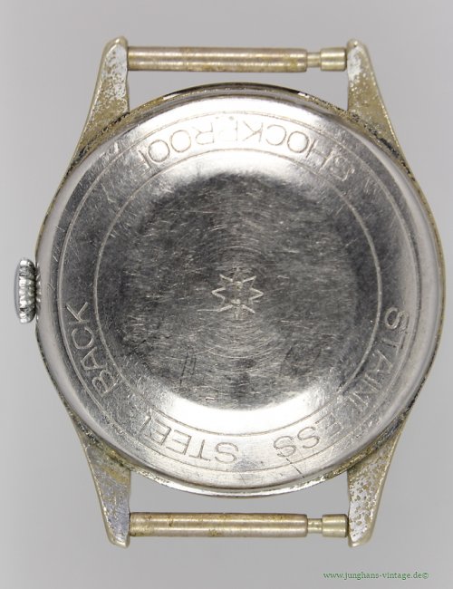 Markenzeichen/Aufdruck ZB: JUNGHANS 17 JEWELS / Boden: STAINLESS STEEL BACK SHOCK PROOF; mittig 8-strahliger Stern mit J in der Mitte