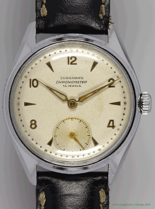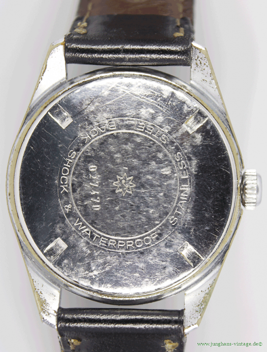 Trademark/imprints: JUNGHANS CHRONOMETER 16 JEWELS; Back: STAINLESS STEEL BACK SHOCK & WATERPROOF; Number: 027470; eight pointed star with J in the centre