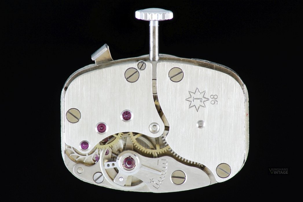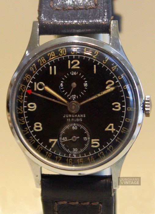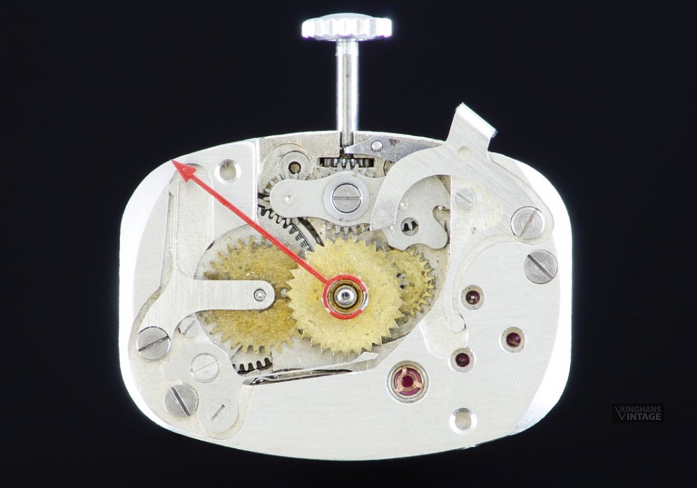 The Junghans J98/2 has a reverse running 24 h indication and a pointer date that can be shifted with a pusher. The Junghans J98/2 was never delivered in series.