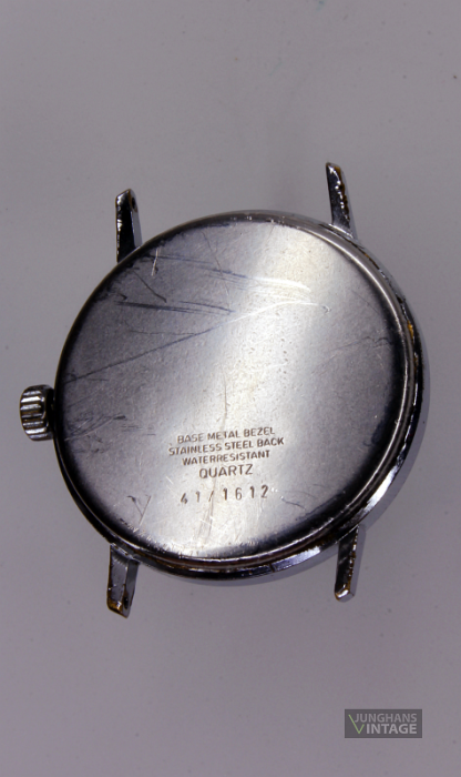 Trademarks/imprint: J in the eight-pointed star (negative); next: JUNGHANS; under center of hands: compact Back: BASE METAL BEZEL STAINLESS STEEL BACK WATERRESISTANT QUARTZ 41/1612