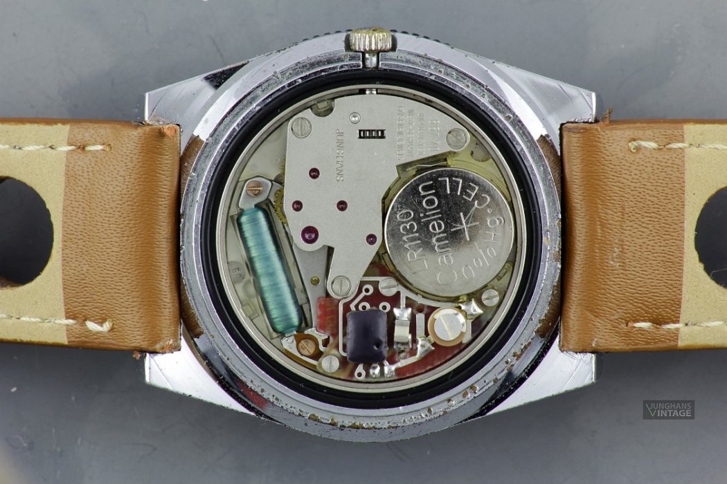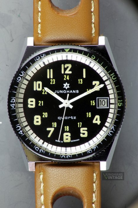 Trademark/imprints: six pointed star with J; JUNGHANS; quartz; below 6: MADE IN GERMANY; Back: JUNGHANS MADE IN GERMANY BASE METALL BEZEL STAINLESS STEEL BACK SHOCK+WATERRESISTANT/DIN 1019145