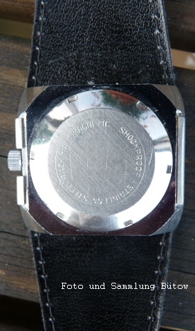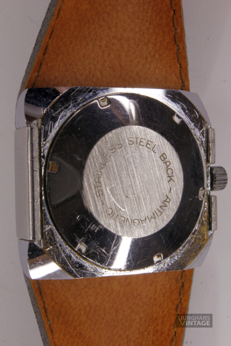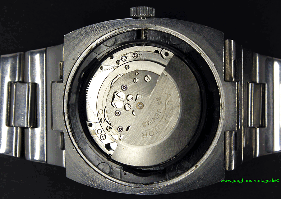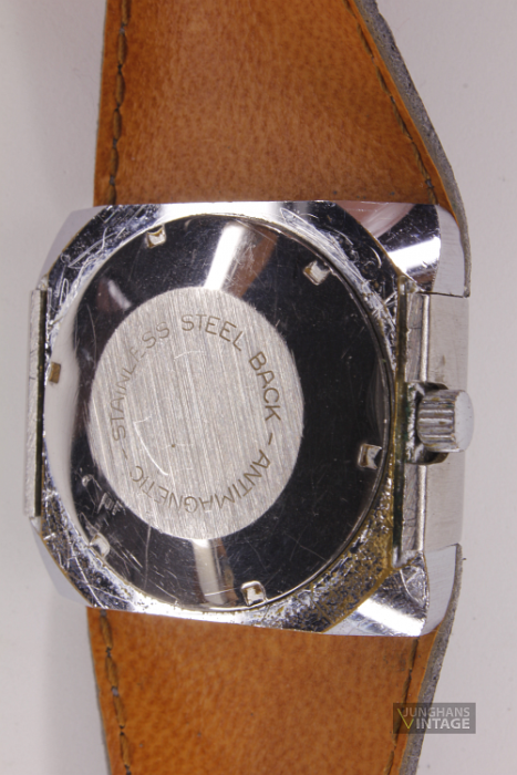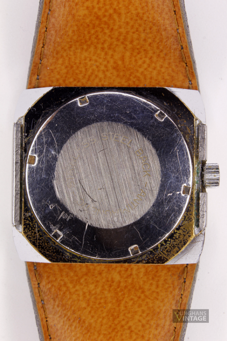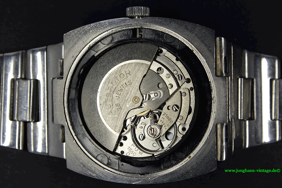 This watch is clearly a child of the 70s. The movement comes from the forge of Pforzheimer watch Rohwerke GmbH (PUW) and is held by an encasing ring made of plastic.