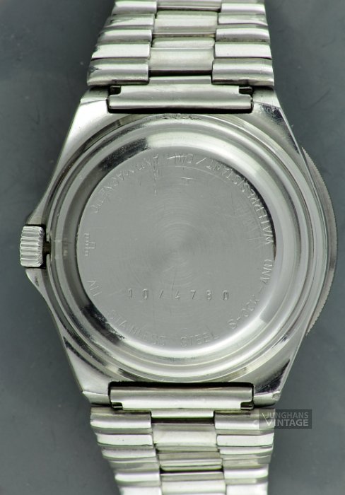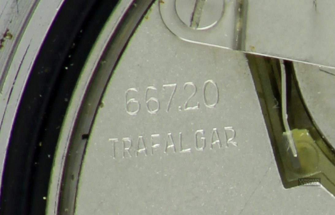 The date of registration is close to the poduction time of the caliber Junghans 667: 1975 to 1981. The production time of the reference 10/4760.44 was between 1977 . 1980. So maybe Junghans sold the movement to London? If anybody knows more details about a possible collaboration between Junghans and TRAFALGAR pleas let me know...