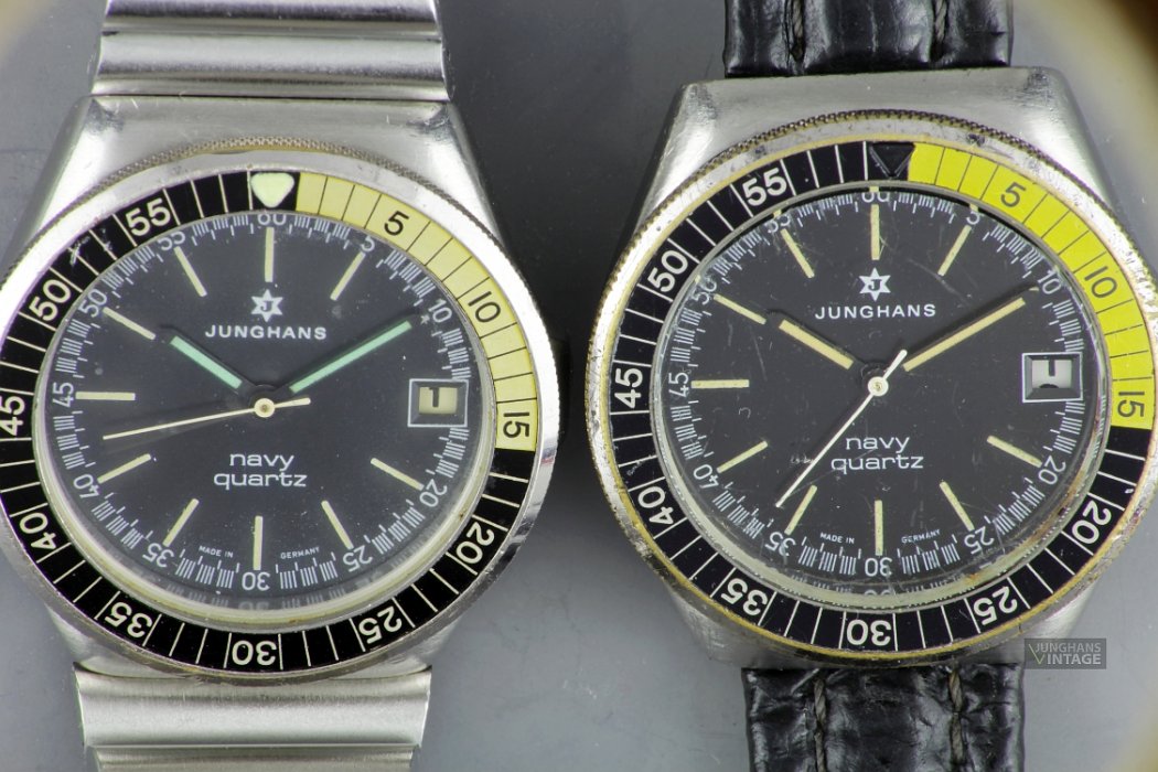 This Junghans watch shows the clear design of a diver's watch. The bezel is only rotatable counterclockwise and has minute increments. The first 15 minutes on the bezel are color-contrasted. Two different variations are known, left more yellowish and the right one a rather slight golden tone.