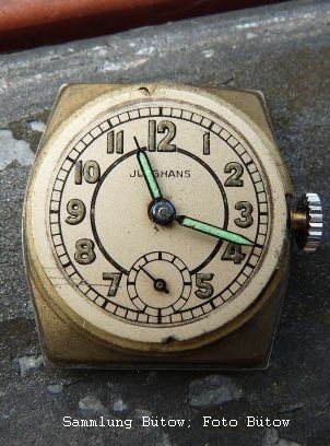 Often the dials without brand names or marks have been put on the market. At this watch from the collection Bütow the dial has been printed with the brand name of the company Junghans which was the actual movement manufacturer. On the movement, however, the ZentRa has engraved its own caliber designation (Zentra 637).