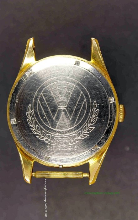 Already in the late 40s of the last century, VW Beetle drivers were handes over watches if they had managed 100,000 km (breakdown-free) with their vehicle. Originally the watches were equipped with personalized engraving on the back cover. With the beginning of the 50s they only became only a single engraving with the "VW" logo, the number "100 000", and including "kilometers", framed by a laurel.