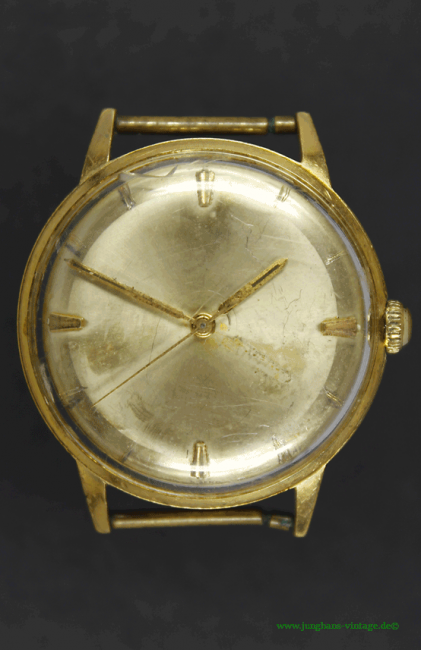 Die Uhr wurde Opfer eines absolut unfachmännischen Aufbereitungsversuchs des Zifferblattes. Das Zifferblatt wurde abgeschliffen, die ursprünglichen Indexe wurden eingeritzt.  Trotzdem wird die Uhr hier als Beispiel des Junghans J87 gezeigt, um den Unterschied zum Junghans 687.00 mit dem beweglichen Spiralklözchenträger zu zeigen.