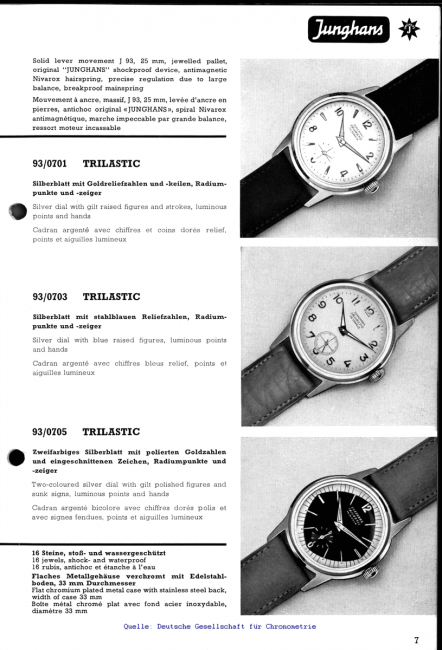 Die Krone und die Zeiger sind nicht original, wie im Katalog von 1958 zu sehen ist. Die Abbildung in der Mitte zeigt nicht exakt die gleiche Uhr, denn die gezeigte Uhr hat goldene Reliefzahlen.