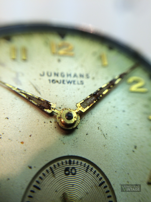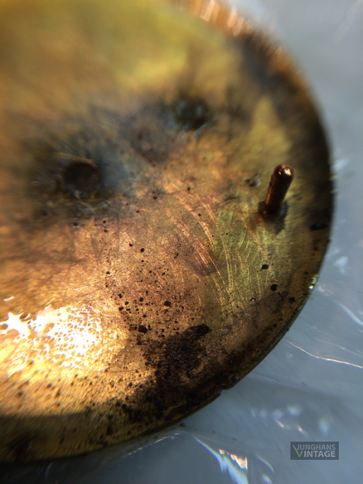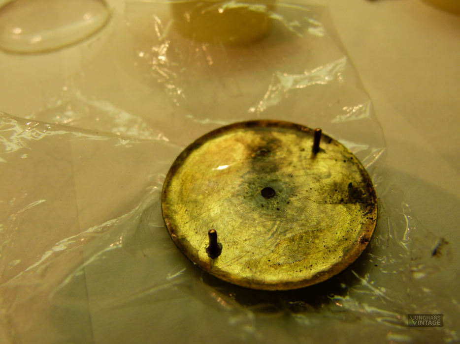 Nachdem die Zeiger entfernt waren, wurde auch der komplette Dreck auf dem Zifferblatt sichtbar. Frühere Uhrmacher hatten schon ausreichend ihre Spuren hinterlassen. Leider waren einige Kratzer zu erkennen.