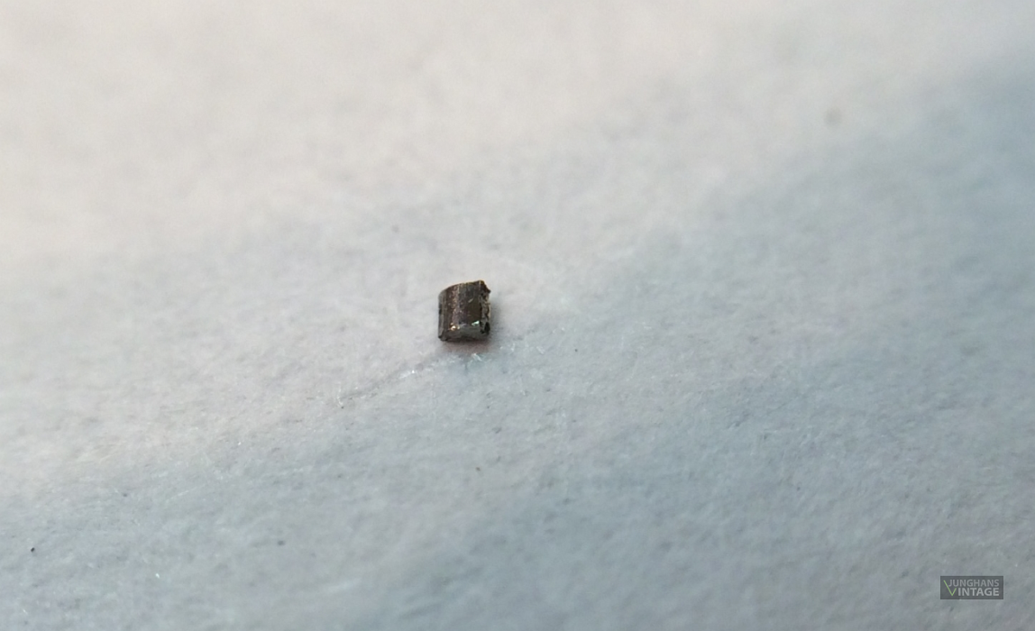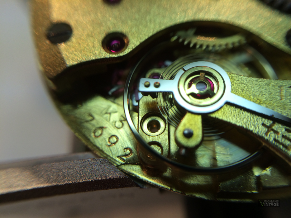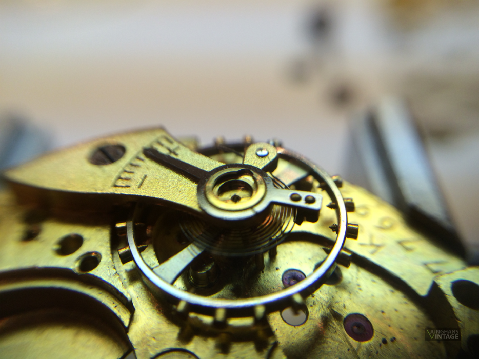 Nach oberflächlicher Inspektion wurde die empfindliche Hemmungsgruppe (Unruh mit Kloben und Anker mit Brücke) entnommen. Das Junghans J82 besitzt einen Anker mit Brücke.