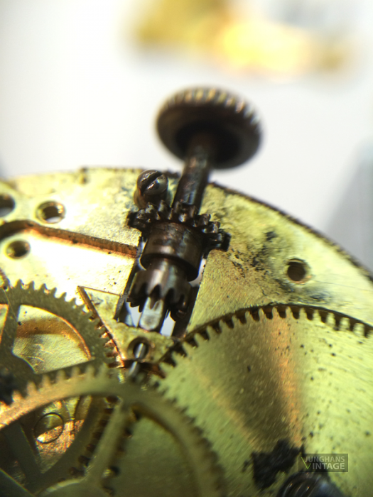 Nach Entfernen der Räderwerksbrücke wurde das Räderwerk begutachtet. Außer Dreck schien hier kein Fehler vorzuliegen.
