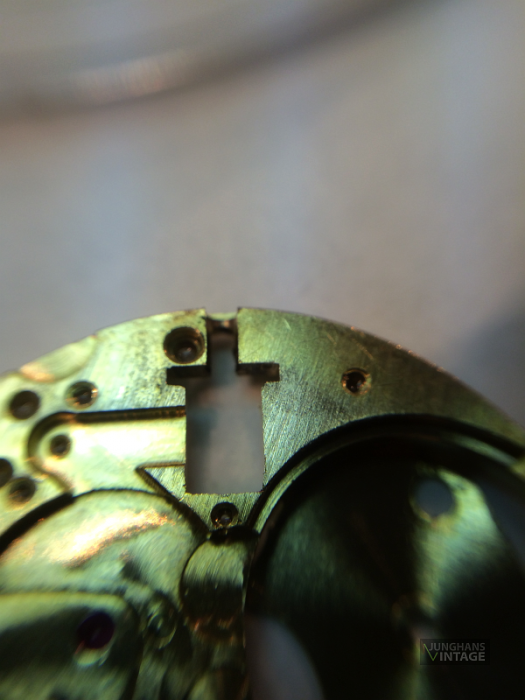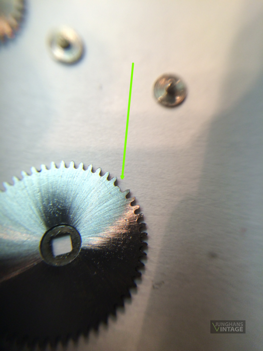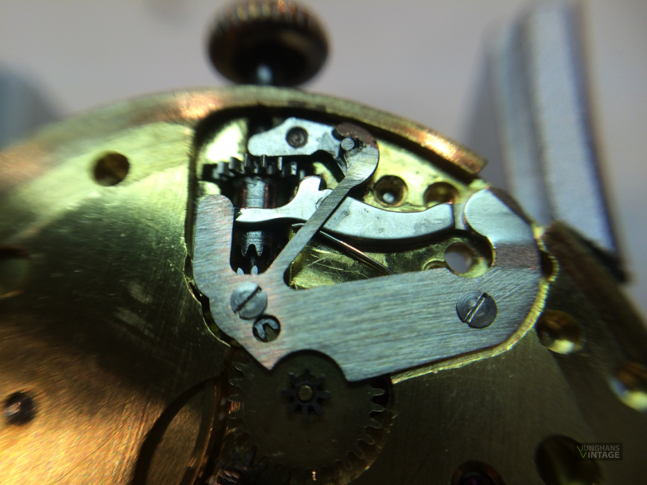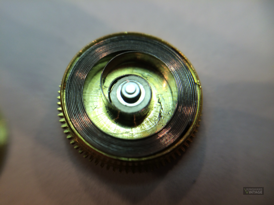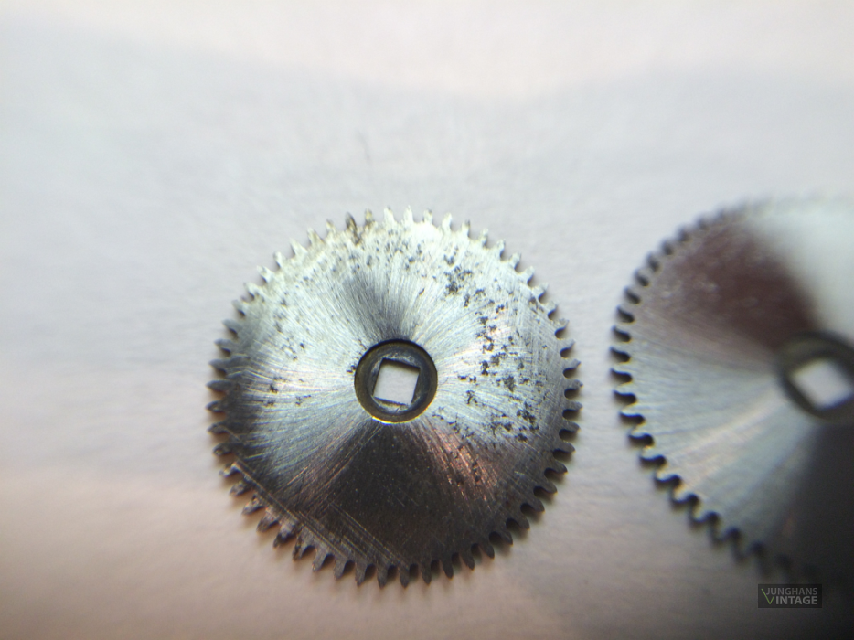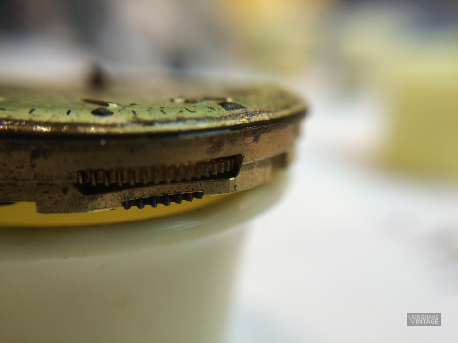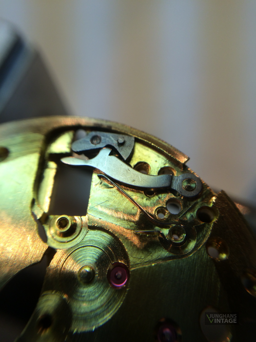 Wie bei Junghans so üblich haben Sperr- und Kronrad ein Linksgewinde.