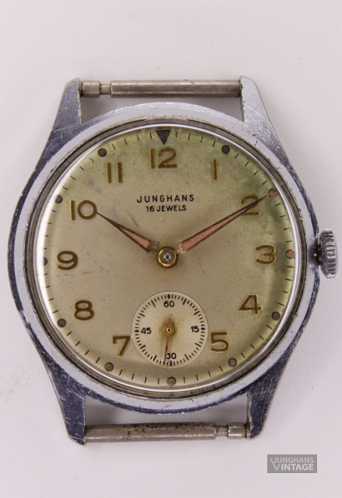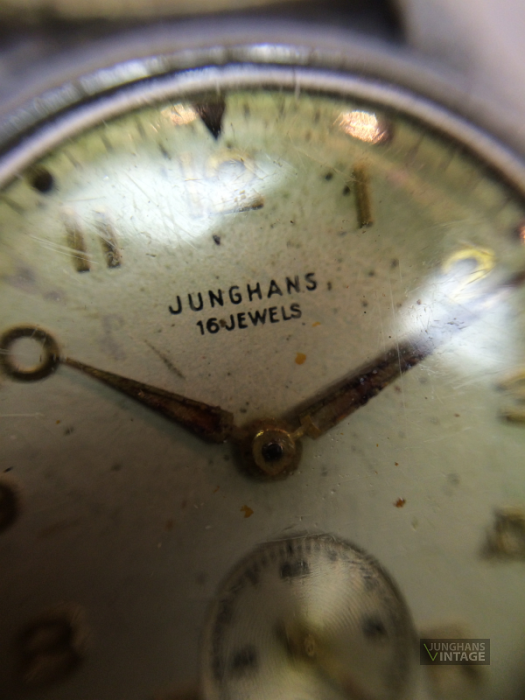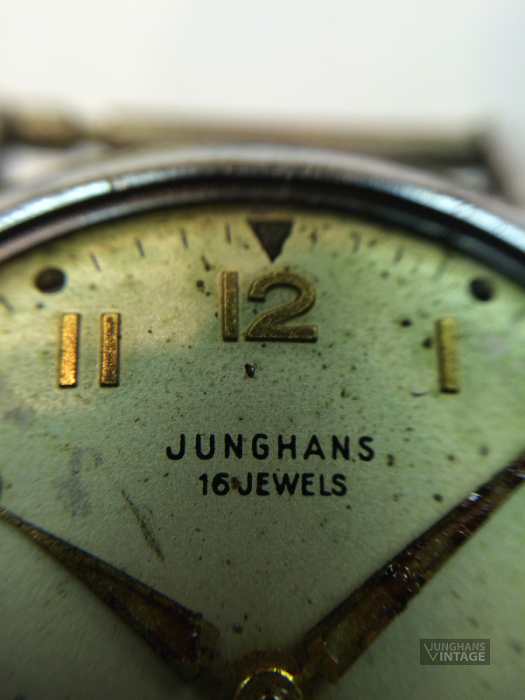 Das Junghans J82 wurde ab 1951 gebaut und natürlich vorher konstruiert. In dieser Zeit waren manchmal noch die altmodischeren Zifferblatt-Fixierschrauben zu finden, die von der Werksseite zugänglich sind. Bei späteren Konstruktionen wurden die Zifferblattfüßchen mit im Werk seitlich angebrachten Madenschrauben fixiert.