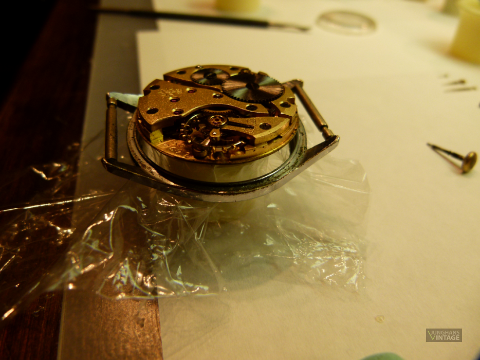 Das Werk steckte sehr fest im Gehäuse und musste durch vorsichtigen Druck über das Zifferblatt nach hinten gedrückt werden. Dazu legte ich etwas dünne Plastikfolie als Schutz auf das Zifferblatt.