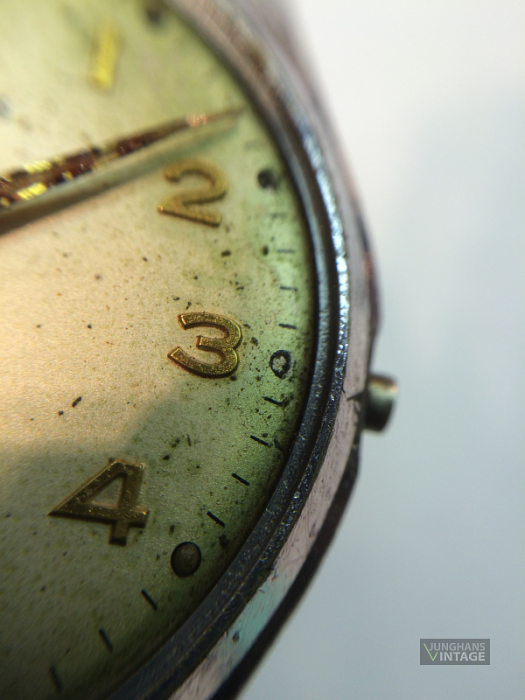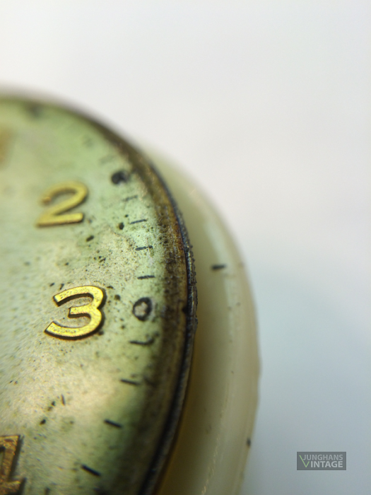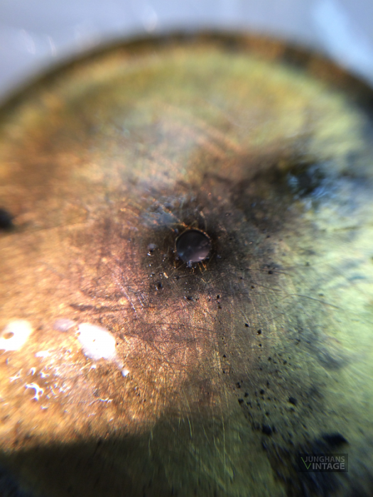 Auch jetzt zeigte sich wieder viel Verschmutzung auf den Seiten des Werkes und des Zifferblattes. Der Radium Leuchtpunkt bei 3 fehlte komplett, der bei 2 war nur noch halb vorhanden.