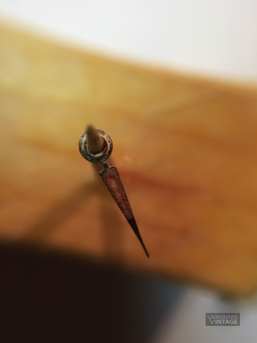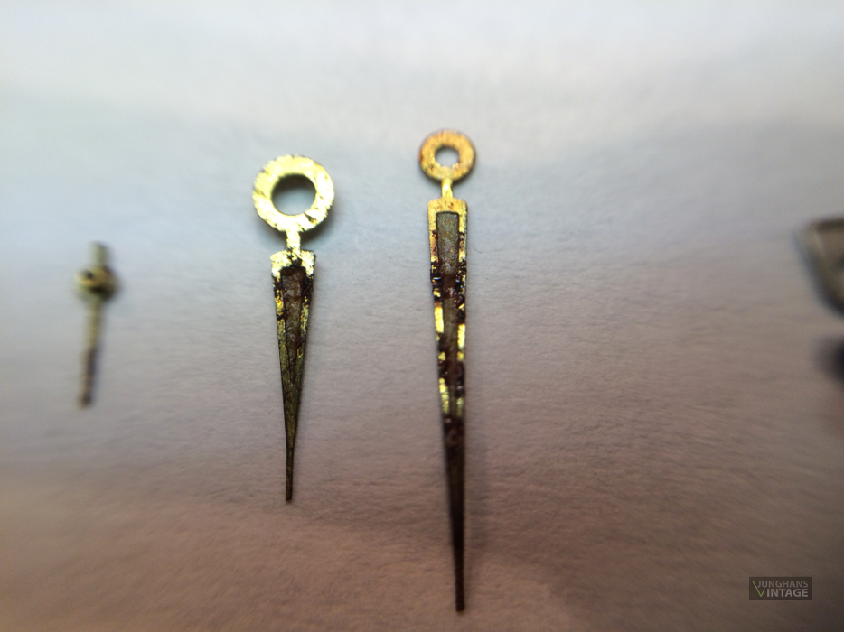 Auch wenn die Leuchtmasse der Zeiger noch intakt war, musste diese komplett weichen, um die Zeiger wenigstens einigermaßen von Rost und Korrosion zu befreien. Leider habe ich noch immer keine Möglichkeit, Zeiger neu zu vergolden, daher habe ich diese nur oberflächlich bearbeitet.