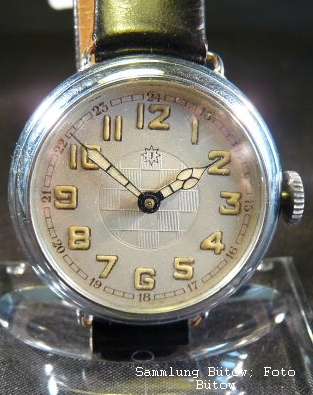 • Dial: beige, stained, patinated; centrally floral pattern with circular-circumferential grooves; Radium luminous numerals 1 - 12; orbiting black dash minutes;