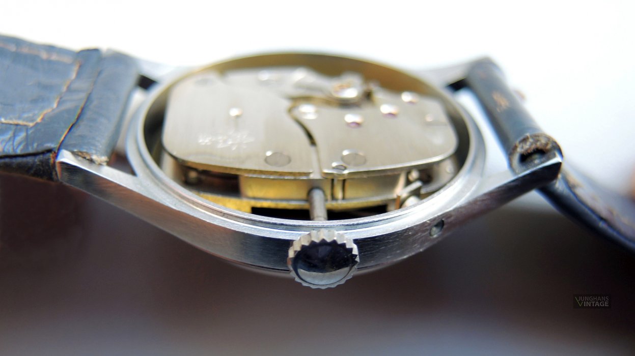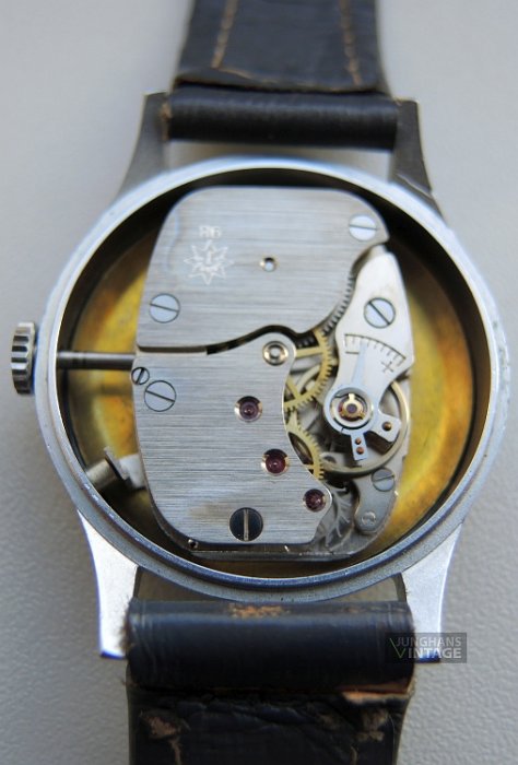 The Junghans J98/2 has a reverse running 24 h indication and a pointer date that can be shifted with a pusher. The Junghans J98/2 was never delivered in series.