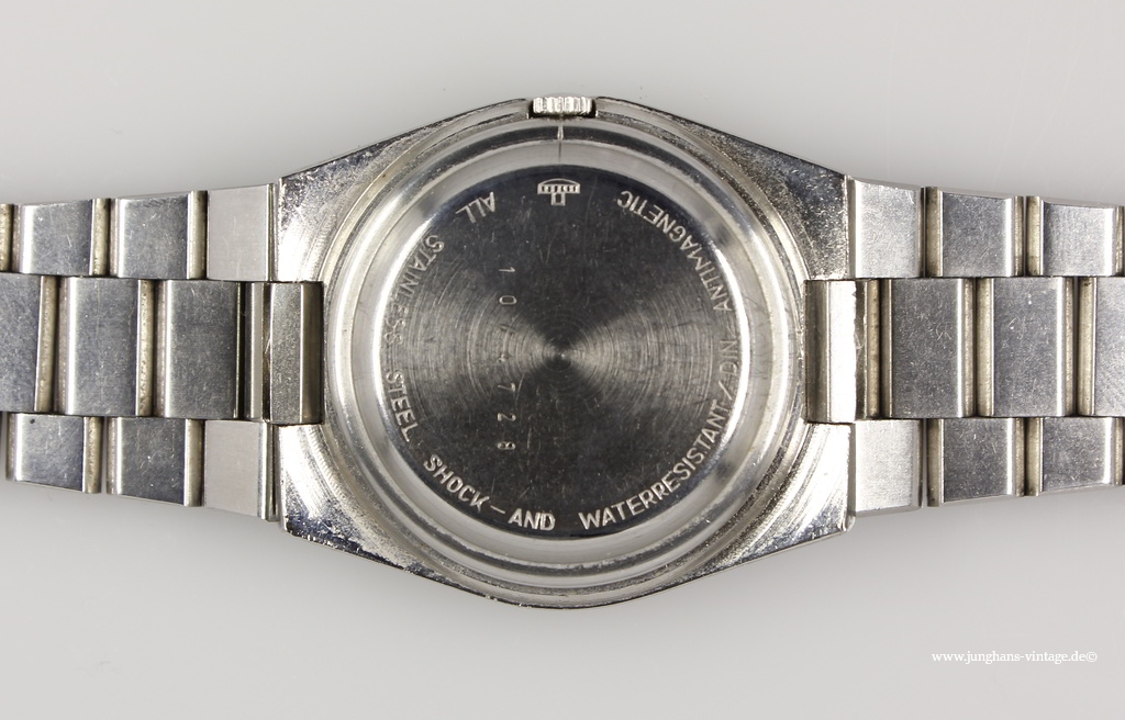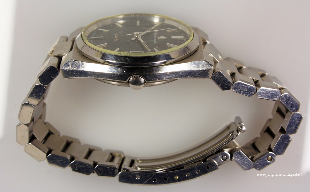 This watch with the original bracelet and just such clasp shows two different Junghans trademark: On the dial and on the movement is the J in the six -pointed star, on the clasp the J in the eight-pointed star.